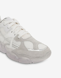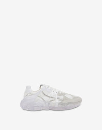 Mesh running shoes with contrasting details and transparent Moschino Teddy Bear-shaped sole. - Wide Fit - Logo on tongue - Calfskin details - Silver laminated details - Lace-up fastening - Transparent rubber Teddy sole Bottom:100% Rubber Lining:50% Calfskin, 50% Polyester Upper:8% Calfskin, 70% Polyester, 1% Polyethylene Terephthalate, 21% Polyurethane Code: POLMA15283G1IMM110A FIT - Wide Fit - Heel Height : 3 cm