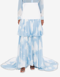 LONG SKIRT WITH A TRAIN IN SILK GEORGETTE WITH ARCHIVAL CLOUD PRINT ALL OVER. THE CONTRASTING UPPER PART IS MADE OF COTTON BULL. PRODUCT DETAILS REGULAR FIT - HIGH WAIST - FRONT POCKET EFFECT OPENINGS - SIDE ZIP CLOSURE FABRIC: 100% SILK SKU: AEF242D J010554562294 FITTING & DIMENSIONS - MODEL HEIGHT: 1.78 CM - MODEL BUST: 82 CM - MODEL WAIST: 60 CM - MODEL HIPS: 88 CM - MODEL SIZE: 40