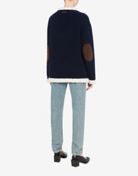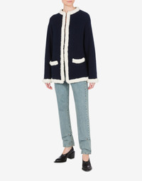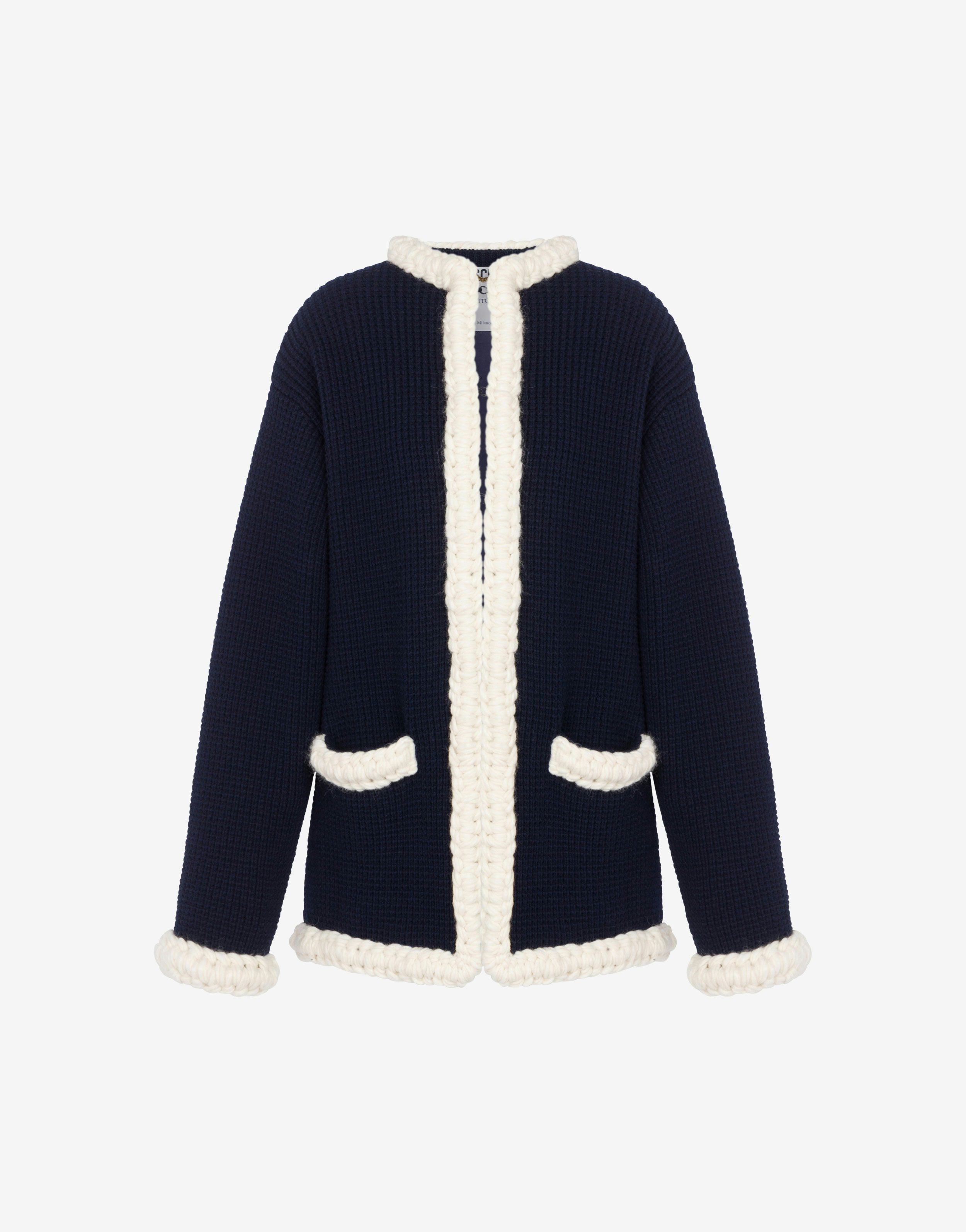 FINE LAMBSWOOL KNIT JACKET WITH CONTRASTING BRAIDED KNIT DETAILS AND SUEDE ELBOW PATCHES. LEATHER LOGO LABEL ON THE BACK TWO FRONT POCKETS DROPPED SHOULDERS FRONT HOOK CLOSURE LINED FABRIC: 100% PURE WOOL LINING: 100% VISCOSE CODE: AEF242D 058054001510
