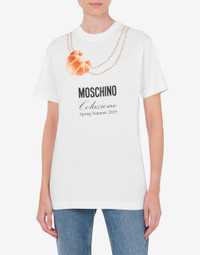 ORGANIC COTTON JERSEY T-SHIRT WITH CROISSANT NECKLACE AND MOSCHINO BREAKFAST LOGO. PRODUCT DETAILS RELAXED FIT - SHORT SLEEVES FABRIC: 100% COTTON SKU: AEF251E A070305411001 FITTING & DIMENSIONS - MODEL HEIGHT: 180 CM - MODEL BUST: 80 CM - MODEL WAIST: 60 CM - MODEL HIPS: 89 CM - MODEL SIZE: 40