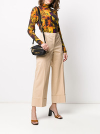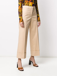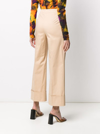 wide-leg trousers Khaki cotton wide-leg trousers from Boutique Moschino featuring a high rise, a wide leg, pressed creases and a concealed hook and zip fastening. Imported Composition Outer: Cotton 98%, Spandex/Elastane 2% Lining: Cotton 100% SIZE & FIT Model measurements Height 5 ft 9 in(1.74 m) Bust/Chest 32.28 in(82 cm) Hips 35.82 in(91 cm) Waist 24.01 in(61 cm) Washing instructions Dry Clean Only