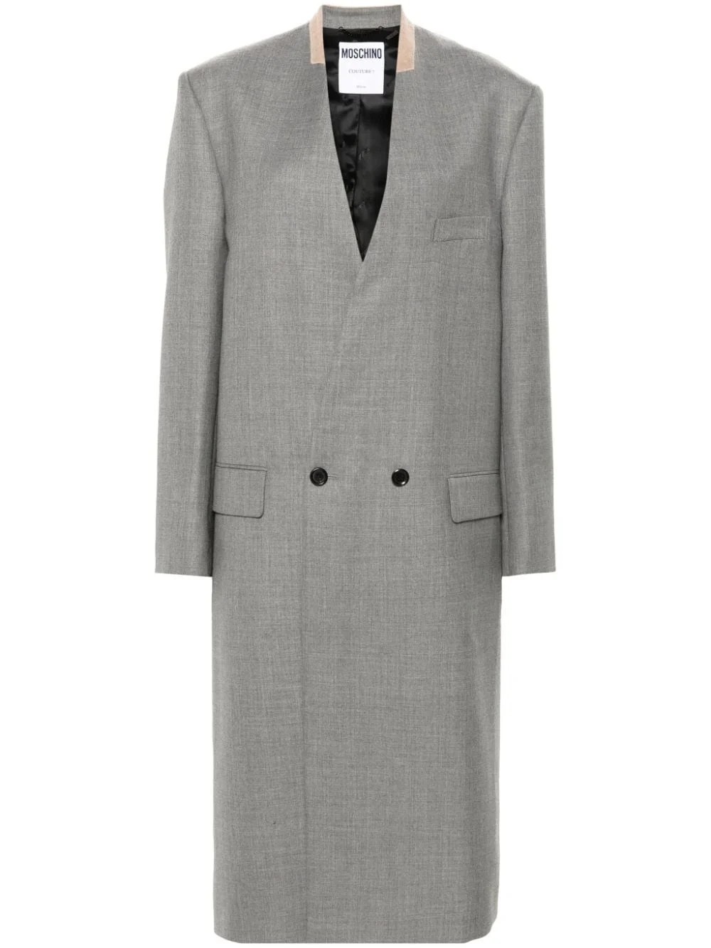wool coat Highlights - Grey - Virgin wool - Textured finish - Double-breasted button fastening - V-neck - Long sleeves - Chest welt pocket - Two side flap pockets - Internal jetted pocket - Logo-jacquard lining - Straight hem - Mid-length Made in Italy Composition Outer: Virgin Wool 100% Lining: Viscose 100% SIZE & FIT Model measurements Height 5 ft 9 in(1.75 m) Bust/Chest 34.64 in(88 cm) Hips 36.61 in(93 cm) Waist 26.37 in(67 cm) FittingInformation Designed for a boxy fit, intended for a loose fit throughout The internal shoulder pads offer a structured shape Made from a midweight non-stretch fabric