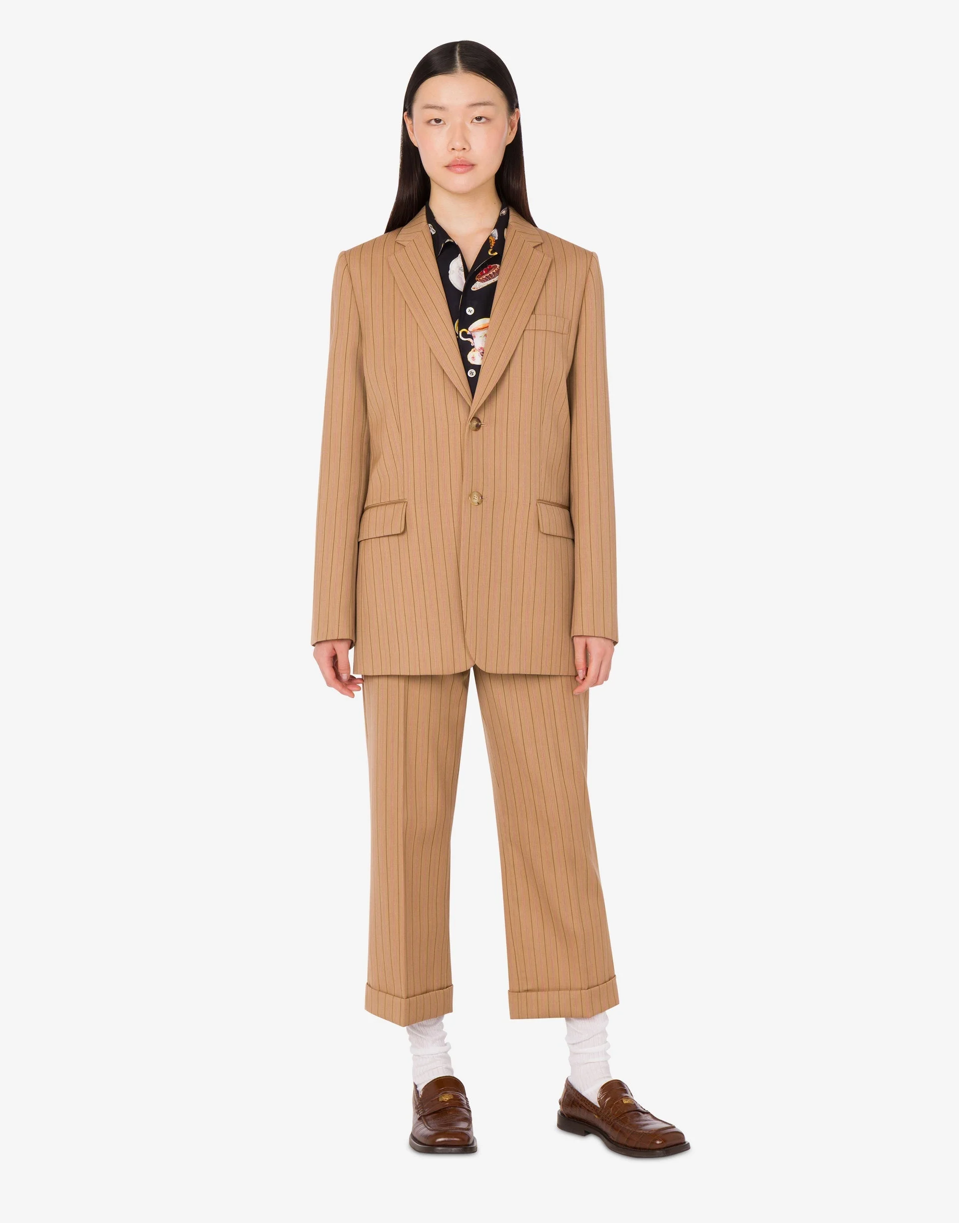 THE FALL/WINTER 2025 PRE-COLLECTION FEATURES THE WOOL PINSTRIPE CROP PANT WITH TURN-UPS AT THE BOTTOM. PRODUCT DETAILS CROPPED FIT - REGULAR WAIST - TWO SIDE POCKETS - BELT LOOPS AT WAIST - BACK WELT POCKET WITH BUTTON - FRONT CLOSURE WITH COVERED ZIPPER AND HIDDEN HOOK FABRIC: 100% PURE WOOL SKU: AEF252E A030655361091 FITTING & DIMENSIONS - MODEL HEIGHT: 177 CM - MODEL BUST: 81 CM - MODEL WAIST: 63 CM - MODEL HIPS: 92 CM - MODEL SIZE: 40