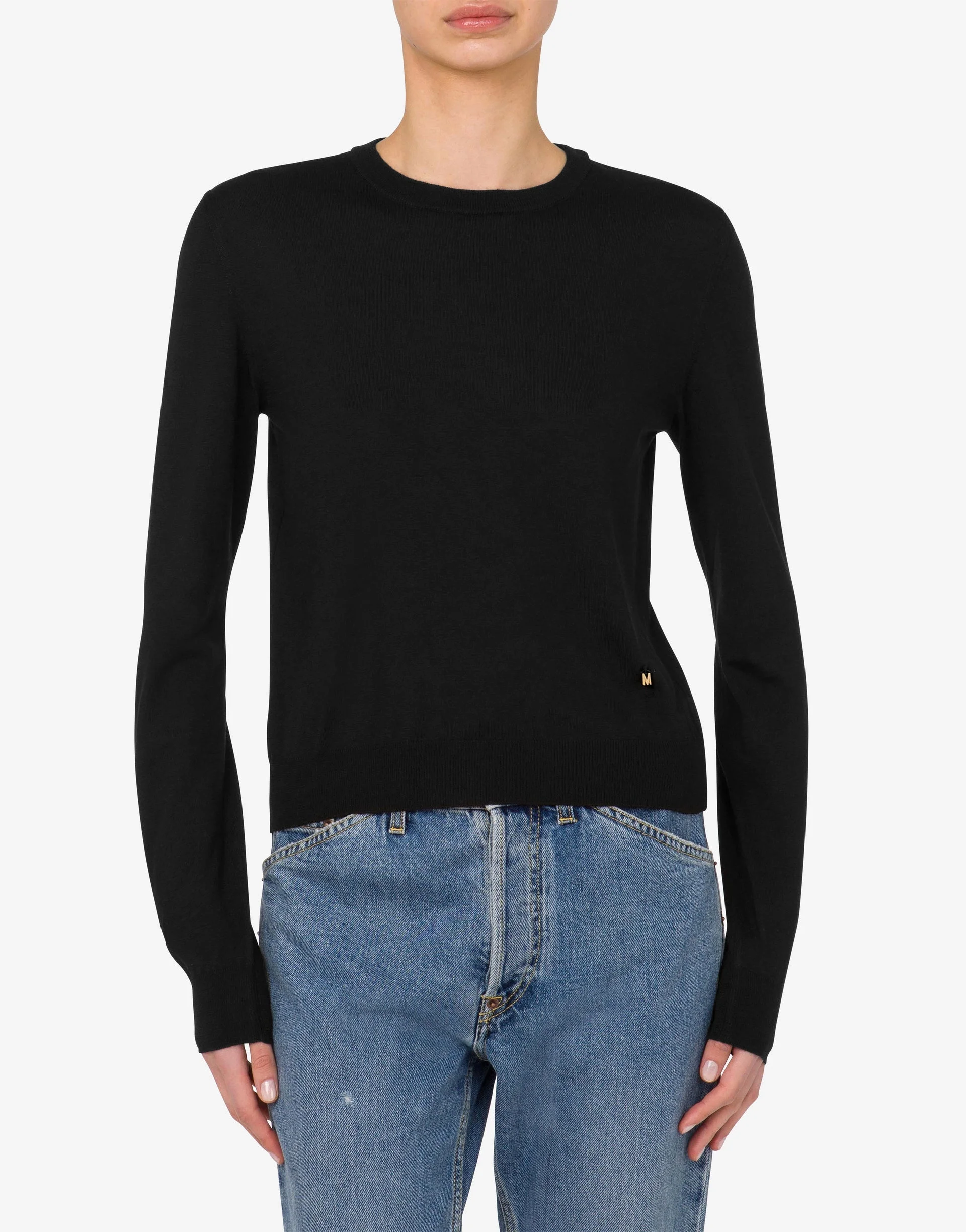FINE WOOL AND SILK JUMPER WITH SMALL M IN GOLD-TONE GALVANISED METAL. PRODUCT DETAILS REGULAR FIT - METAL M LETTER - CREW NECK FABRIC: 70% PURE WOOL, 30% SILK SKU: AEF251E J090905010555 FITTING & DIMENSIONS - MODEL HEIGHT: 180 CM - MODEL BUST: 80 CM - MODEL WAIST: 60 CM - MODEL HIPS: 89 CM - MODEL SIZE: 40