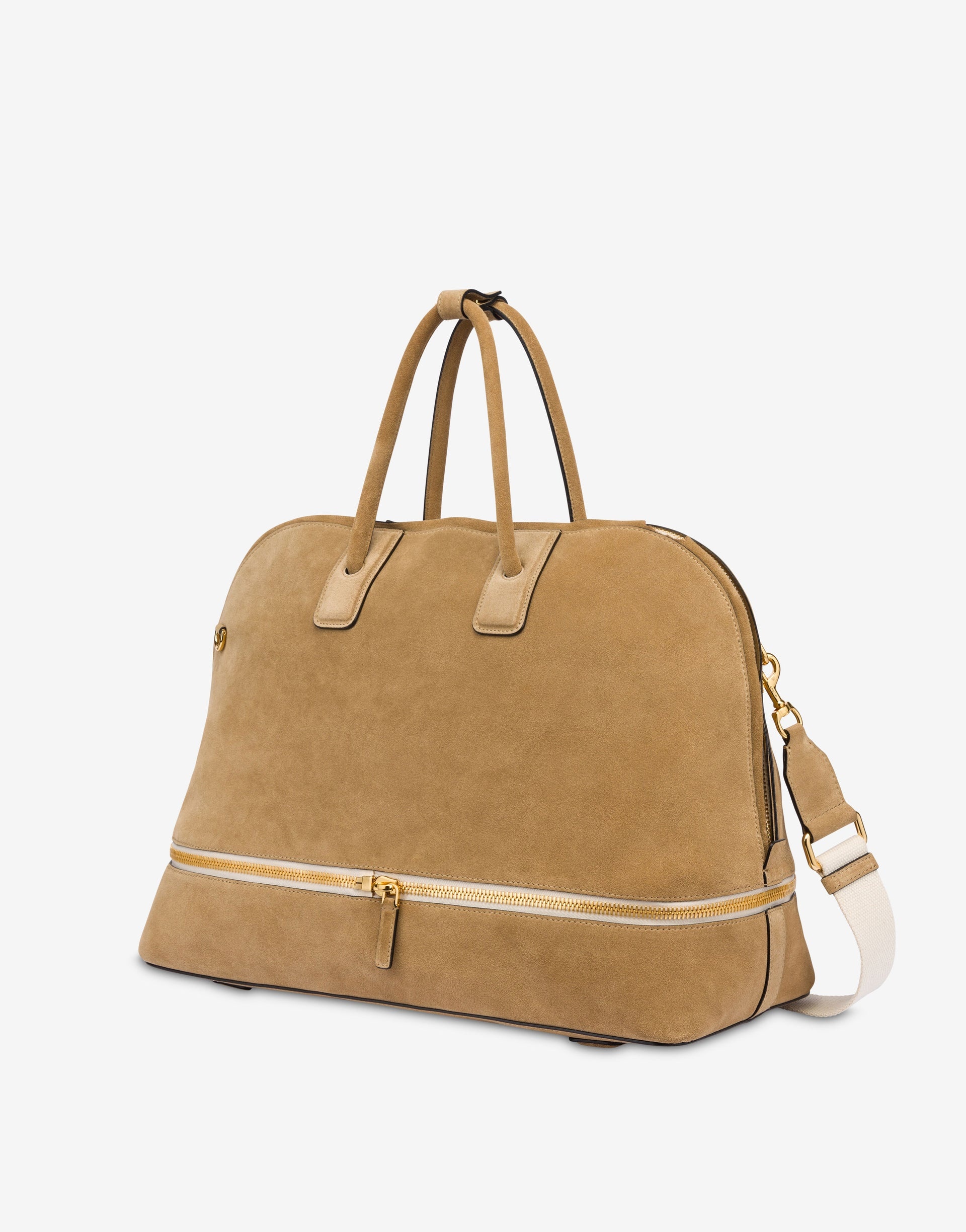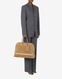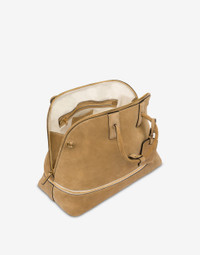 UNIQUE DESIGN HANDBAG WITH AN EXPANDABLE BOTTOM COMPARTMENT VIA ZIPPER. MADE FROM A COMBINATION OF MATERIALS LIKE SUEDE AND NATURAL CANVAS, THIS MODEL EXUDES ELEGANCE AND REFINEMENT. THE TUBULAR HANDLES WITH AN ALMOND SHAPE ARE REINFORCED TO ENSURE GREATE PRODUCT DETAILS - EXPANDABLE CANVAS COMPARTMENT - FOAM-SHAPED DETAILS - REMOVABLE LEATHER TAG - REMOVABLE AND ADJUSTABLE STRAP WITH BUCKLE - ZIP CLOSURE WITH DOUBLE PULL TAB - CANVAS LINING - INTERIOR WITH ZIP POCKET AND SMALL PATCH POCKET UPPER: 90% CALFSKIN, 10% COTTON - LINING: 100% COTTON SKU: POLMC4118PP1MOF110A FITTING & DIMENSIONS - DEPTH: 23 CM - WIDTH: 46 CM - HEIGHT: 34 CM
