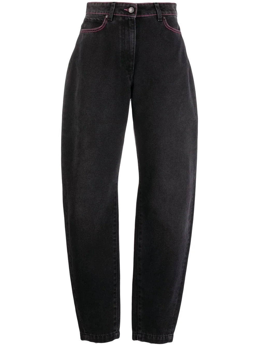 barrel-leg high waisted jeans Cut with a contemporary barrel leg silhouette, these MSGM jeans appear in black denim with contrasting pink stitching for a subtle pop of colour. The pair sits high at the waist for a flattering effect. Made in Italy Composition Lining: Polyester 65%, Cotton 35% Outer: Cotton 100% SIZE & FIT Model measurements Height 5 ft 11 in(1.8 m) Bust/Chest 31.49 in(80 cm) Hips 35.82 in(91 cm) Waist 24.8 in(63 cm) FittingInformation This piece fits true to size. We recommend you get your regular size Cut for a slim fit Made with a mid-weight non-stretch fabric Washing instructions Machine Wash