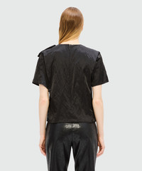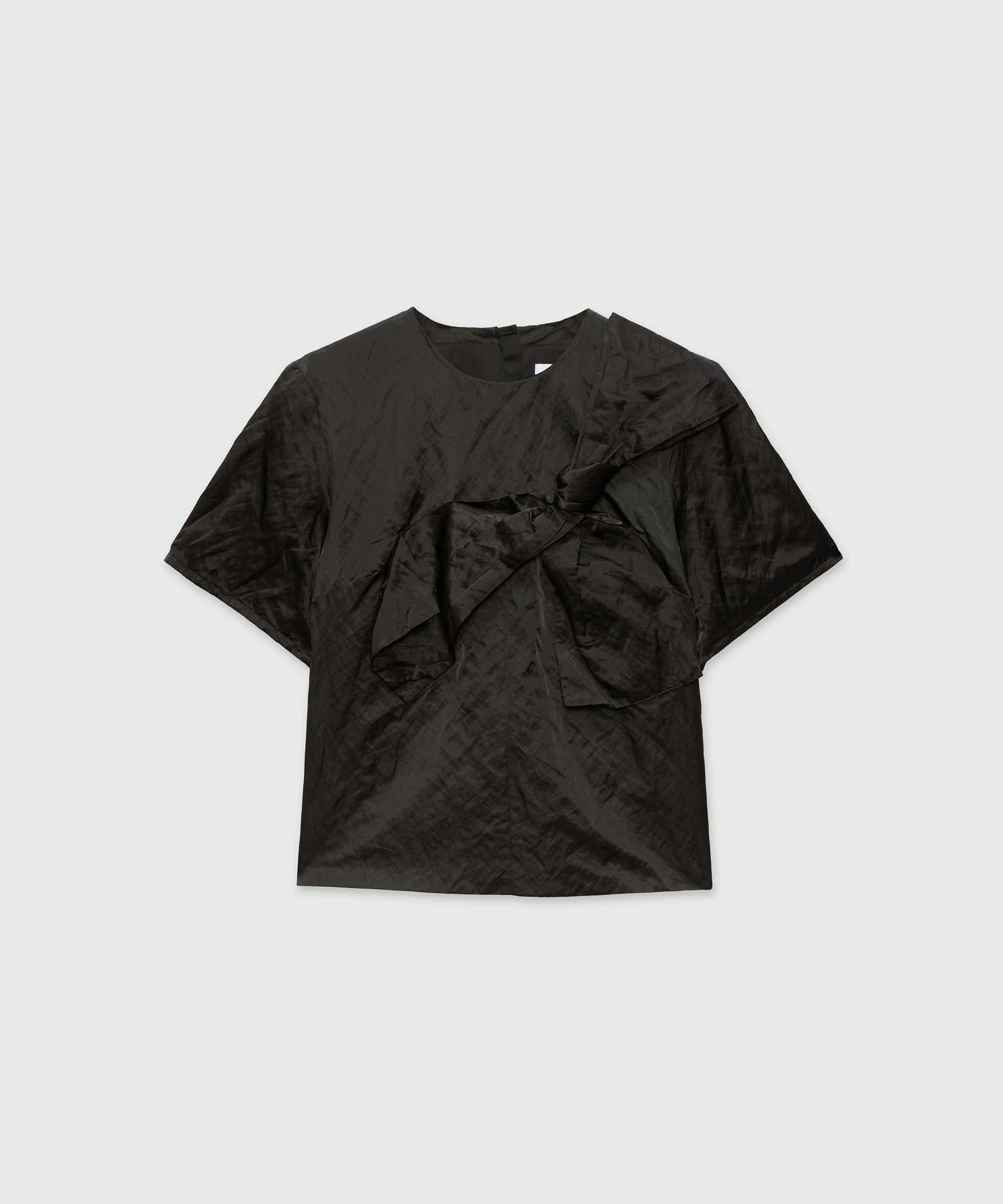 Lightweight, wrinkled-effect duchesse top decorated with a large bow on the front. Round neck, short sleeves, and a hidden back zip closure. Regular fit. Model wears size S/40. CODE: 3941MDM03-257611-99 Details and fit - 49% CO / 43% PA / 8%