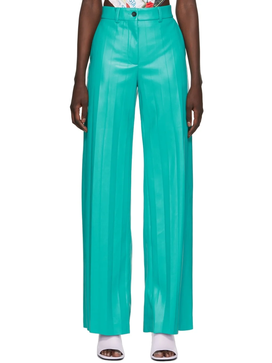 Pleated grained faux-leather pants. · Belt loops · Four-pocket styling · Zip-fly · Darts at back · Unlined Supplier color: Cyan Body: 100% polyester. Lining: 100% polyester. Made in Italy 222443F087004