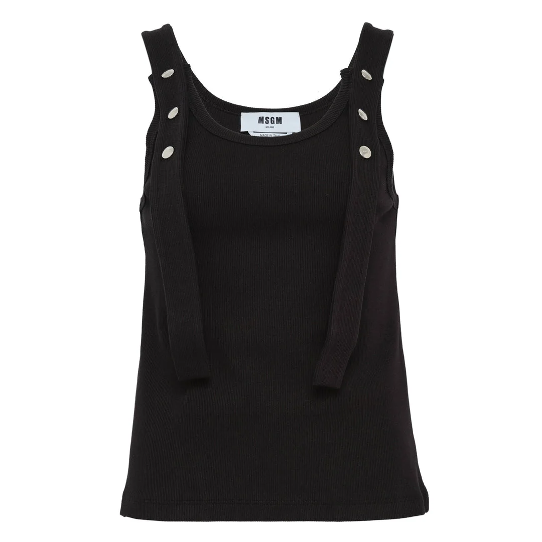 600082352BLK00L / 4041MDT73N/267120/99 - Ribbed cotton construction - Metallic button details on shoulder straps - Round neckline - Sleeveless design - Form-fitting silhouette - Classic black colorway The MSGM Button Strap Tank Top delivers contemporary Italian style with distinctive hardware detailing and modern femininity. Crafted from premium ribbed cotton in classic black, featuring metallic button accents along the shoulder straps for architectural interest. The form-fitting silhouette and signature MSGM design aesthetic create a versatile piece that transitions seamlessly from day to evening wear.