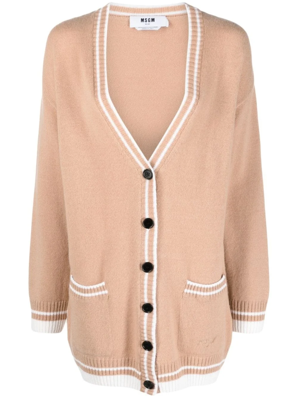 contrasting-trim knit cardigan Highlights - Beige - Wool-cashmere blend - Ribbed detailing - Contrasting trim - V-neck - Front button fastening - Long sleeves - Two front patch pockets - Straight hem Made in Italy Composition Wool 70%, Cashmere 30% SIZE & FIT Model measurements Height 5 ft 10 in(1.78 m) Bust/Chest 32.67 in(83 cm) Hips 35.43 in(90 cm) Waist 23.22 in(59 cm) FittingInformation Designed to be unstructured, offering a loose fit throughout The ribbed hem offers a close, comfortable fit Made with a midweight knit, this piece offers some stretch This piece fits true to size – take your usual size Washing instructions Hand Wash