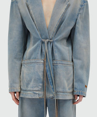 Used effect washed cotton denim jacket characterized by oversized padded shoulders highlighted by the waist cinched in with self-tie straps at the front. Classic lapels and two front patch pockets. Slit on the back bottom. MSGM logo embroidered in contrasting color. Oversized fit. The model wears size S/40. CODE: 3841MDG230L-257275-85 Details and fit - 100% CO
