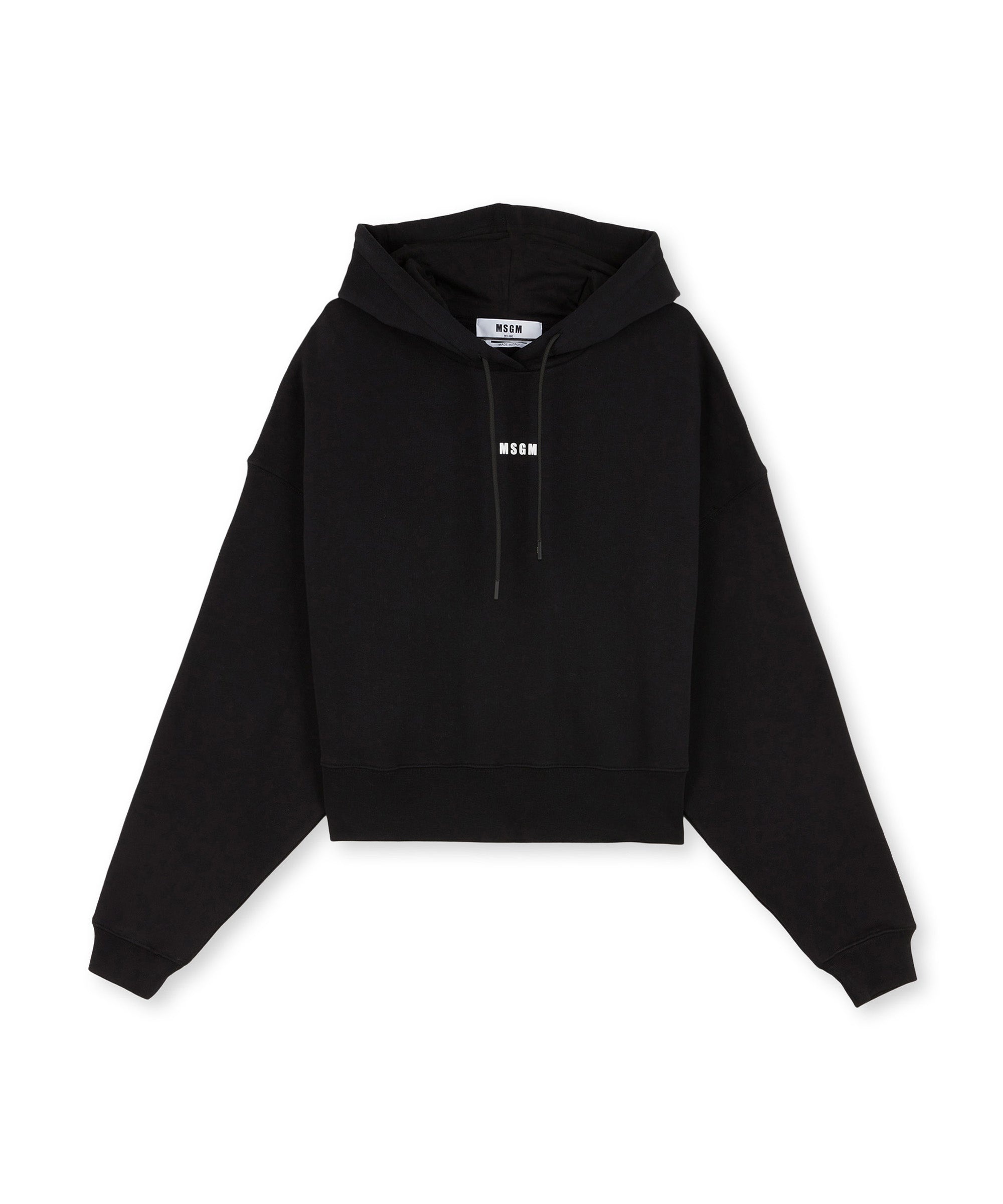 The short cotton sweatshirt is a solid colour garment with long sleeves. The sweatshirt features an adjustable drawstring hood and a micro MSGM logo printed on the front in contrasting cotton. Ribbed bottom hem and cuffs. The interior is cotton gauze. The soft design allows for a Regular fit. The model (female) is wearing a size S / 40 (Height : 176 cm. - Bust : 78 cm. - Chest : 59 cm. - Hips : 89 cm.) CODE: 2000MDM509-200001-99 Details and fit - 100% CO - The model (female) is wearing a size S / 40 (Height : 176 cm - Bust : 78 cm - Chest : 59 cm - Hips : 89 cm) - For information about a product, care and materials, please call us at +39 02 9475 5343 or contact us through Chat. You can also get help by filling out the form in the Help section.