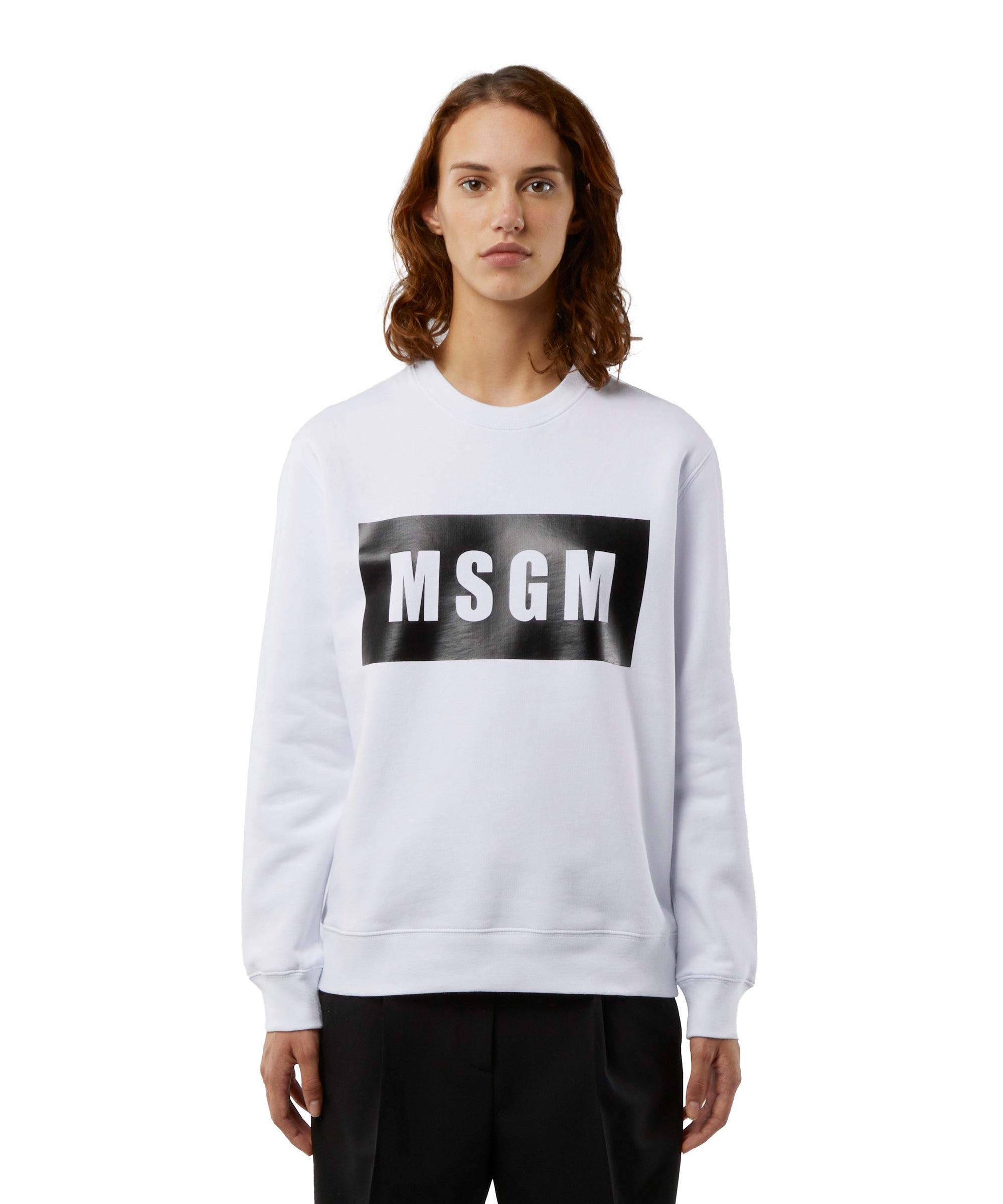 Crew neck cotton sweatshirt. The solid-coloured garment features long sleeves that end in ribbed cuffs. The iconic MSGM box print is on the front. The ribbed knit is on the collar and the bottom hem. Cotton gauze interior. The fit is regular. The model (female) is wearing a size S / 40 (Height : 176 cm. - Bust : 78 cm. - Chest : 59 cm. - Hips : 89 cm.) CODE: 2000MDM523-200001-01 Details and fit - 100% CO - The model (female) is wearing a size S / 40 (Height : 176 cm - Bust : 78 cm - Chest : 59 cm - Hips : 89 cm) - For information about a product, care and materials, please call us at +39 02 9475 5343 or contact us through Chat. You can also get help by filling out the form in the Help section.