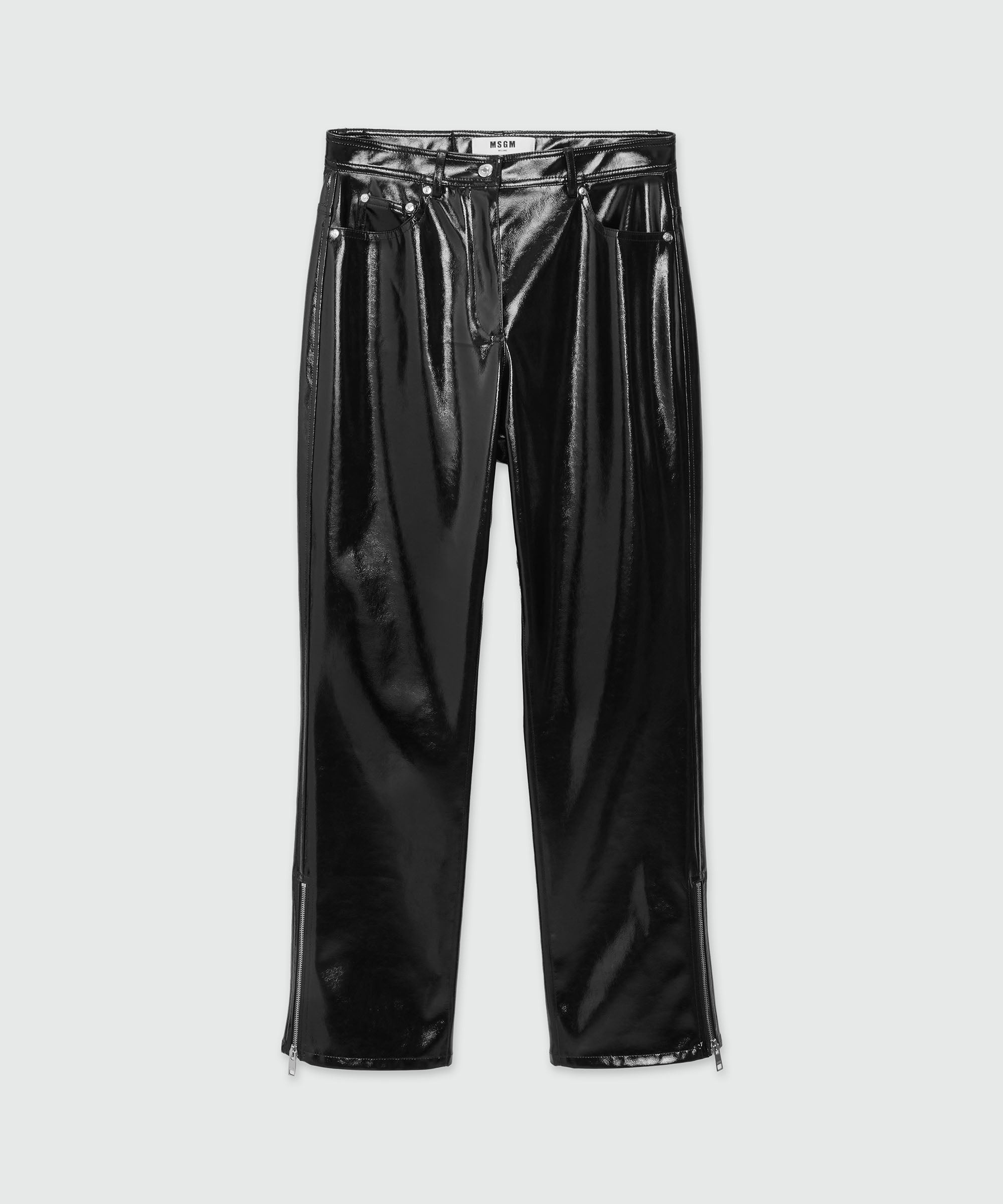 Patent leather medium waist pants with silver metal zipper at the bottom of the leg. Front zipper and button closure, belt loops at the waist. Five pocket model. Regular fit. CODE: 3742MDP08-247800-99 Details and fit - 100% PL - For information about a product, care and materials, please call us at +39 02 9475 5343 or contact us through Chat. You can also get help by filling out the form in the Help section.