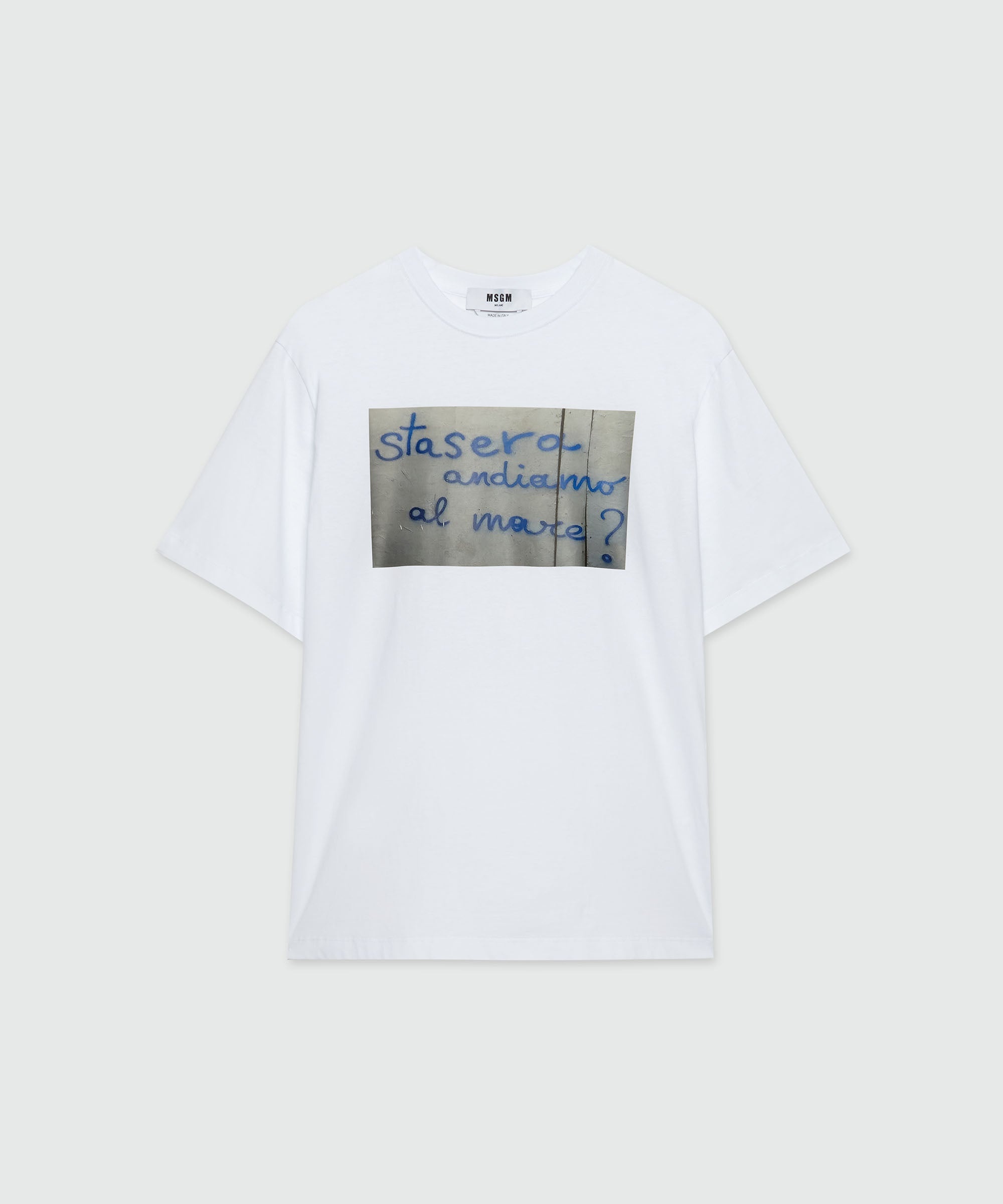 Solid color cotton crew-neck T-Shirt with MSGM quotes "Tonight we're going to the beach" printed on the front. Oversized fit. The model wears size S/40. CODE: 3841MDM149-257002-01 Details and fit - 100% CO