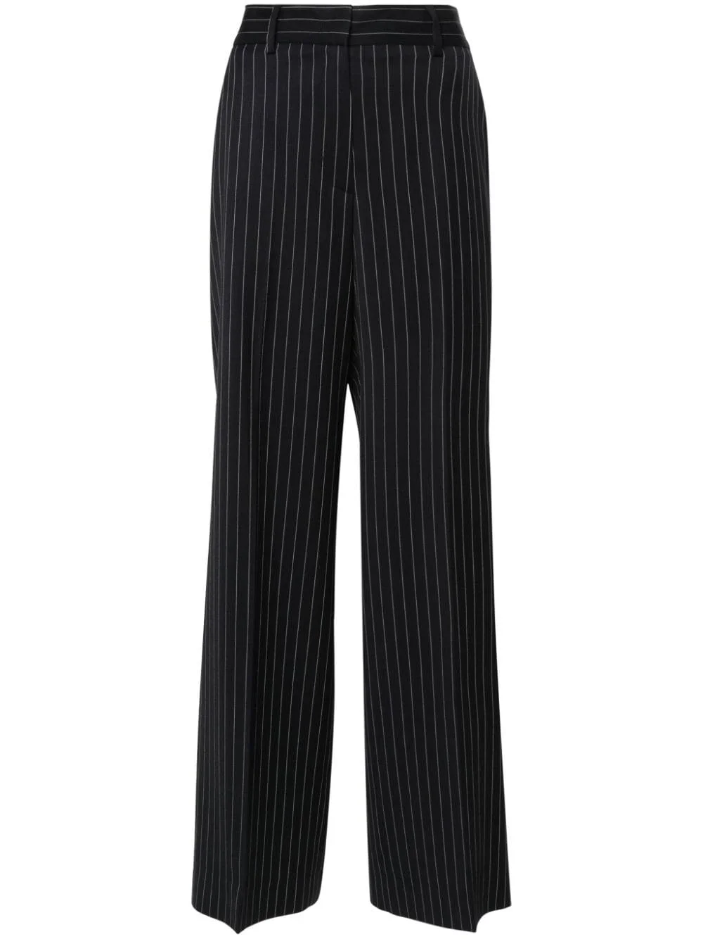 high-waist straight-leg trousers Highlights - Navy blue, white - Virgin wool blend - Twill weave - Pinstripe pattern - High-waisted - Belt loops - Two diagonal pockets to the sides - Two faux pockets to the rear - Pressed crease - Straight leg - Unlined - Concealed front button, hook and zip fastening Made in Italy Composition Outer: Virgin Wool 99%, Polyester 1% Lining: Polyester 100% SIZE & FIT Model measurements Height 5 ft 9 in(1.76 m) Bust/Chest 31.88 in(81 cm) Hips 35.43 in(90 cm) Waist 22.44 in(57 cm) Washing instructions Dry Clean Only