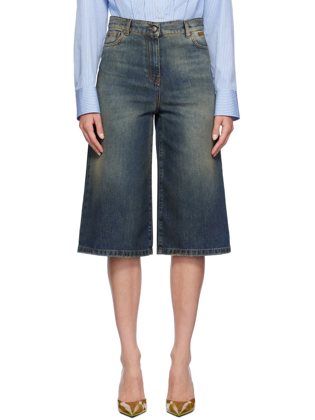 Indigo-dyed non-stretch denim shorts. Fading and subtle distressing throughout. · Belt loops · Five-pocket styling · Zip-fly · Logo embroidered at front pocket · Leather logo patch at back waistband Supplier color: Blue 100% cotton. Made in Italy 242443F088001
