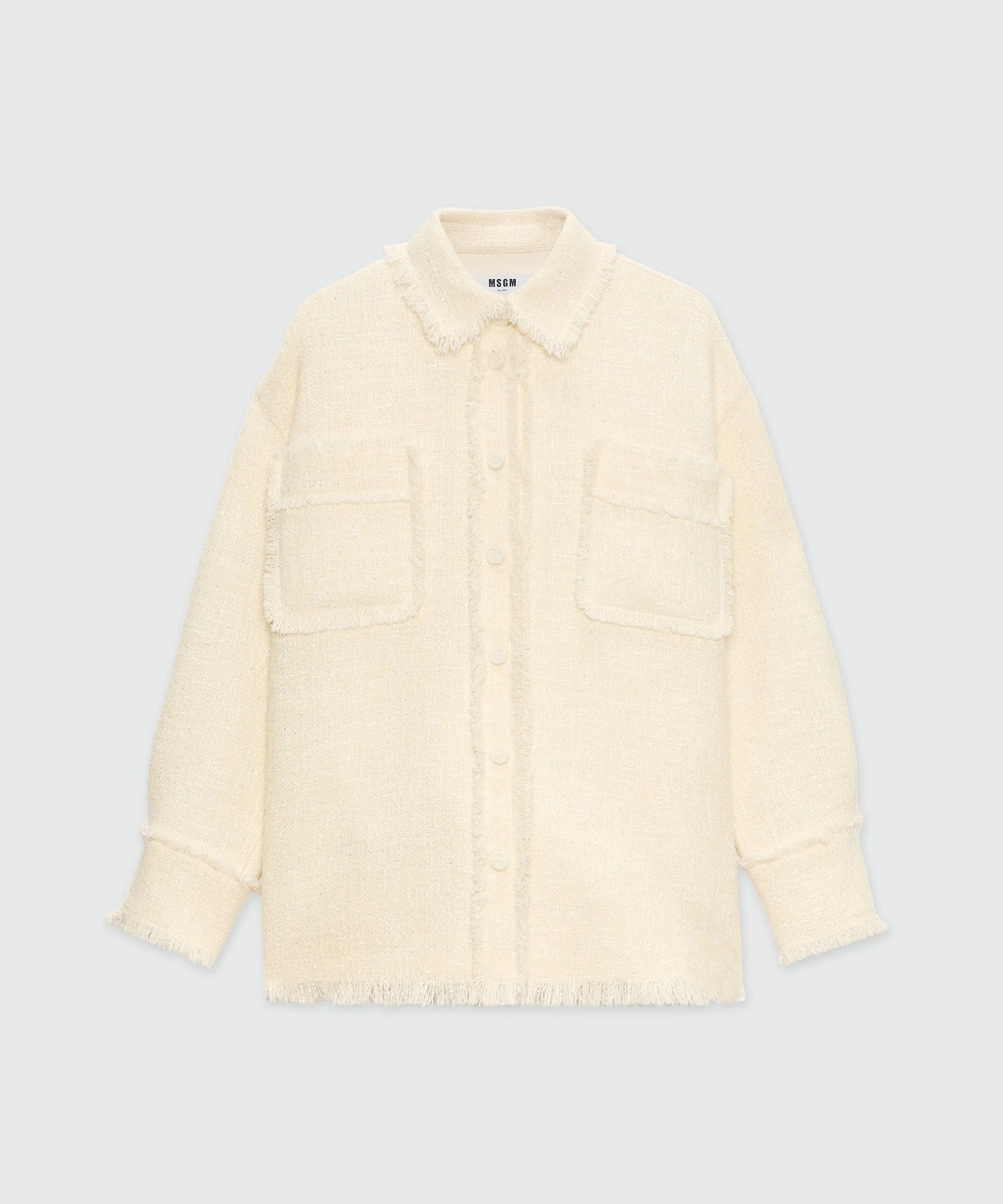 Boucle shirt with micro sequins. Front closure with covered buttons, patch pockets at the chest, and classic collar. Frayed trim detail. Oversized fit. The model is wearing size S/40. CODE: 3941MDE22-257621-02 Details and fit - 28% WV / 27% CO / 22