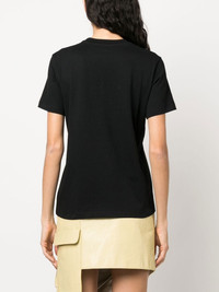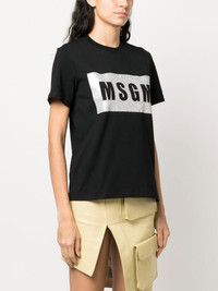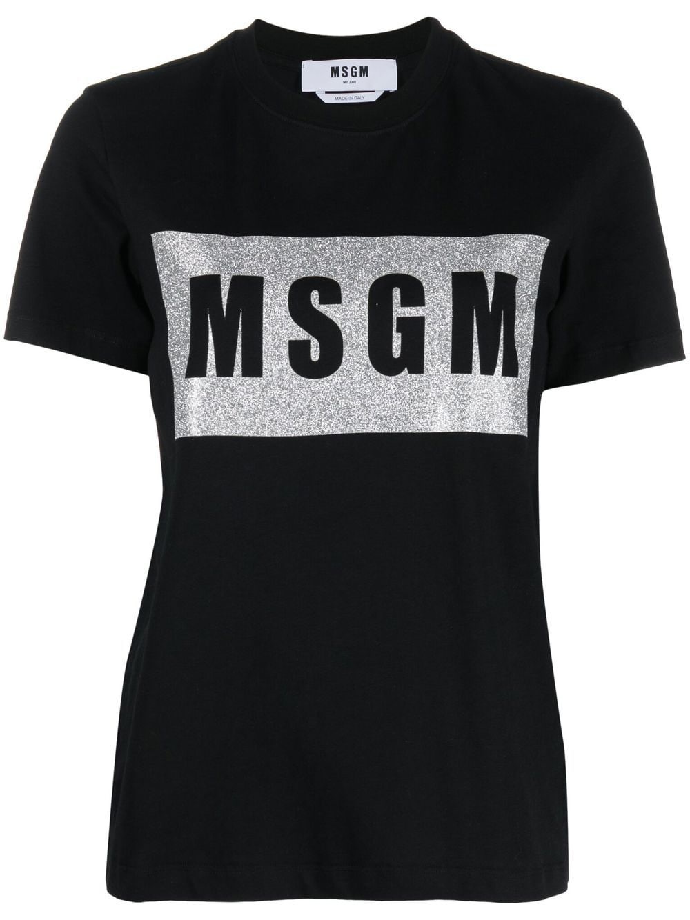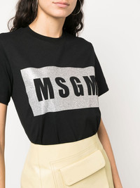 logo-print cotton T-shirt logo-print cotton T-shirt from MSGM featuring black, cotton, logo print to the front, metallic effect, crew neck, short sleeves and straight hem. Made in Italy Composition Cotton 100% SIZE & FIT Model measurements Height 5 ft 10 in(1.79 m) Bust/Chest 33.1 in(84 cm) Hips 35.8 in(91 cm) Waist 24 in(61 cm) FittingInformation Made with a mid-weight fabric Cut for a relaxed fit This piece fits true to size. We recommend you get your regular size