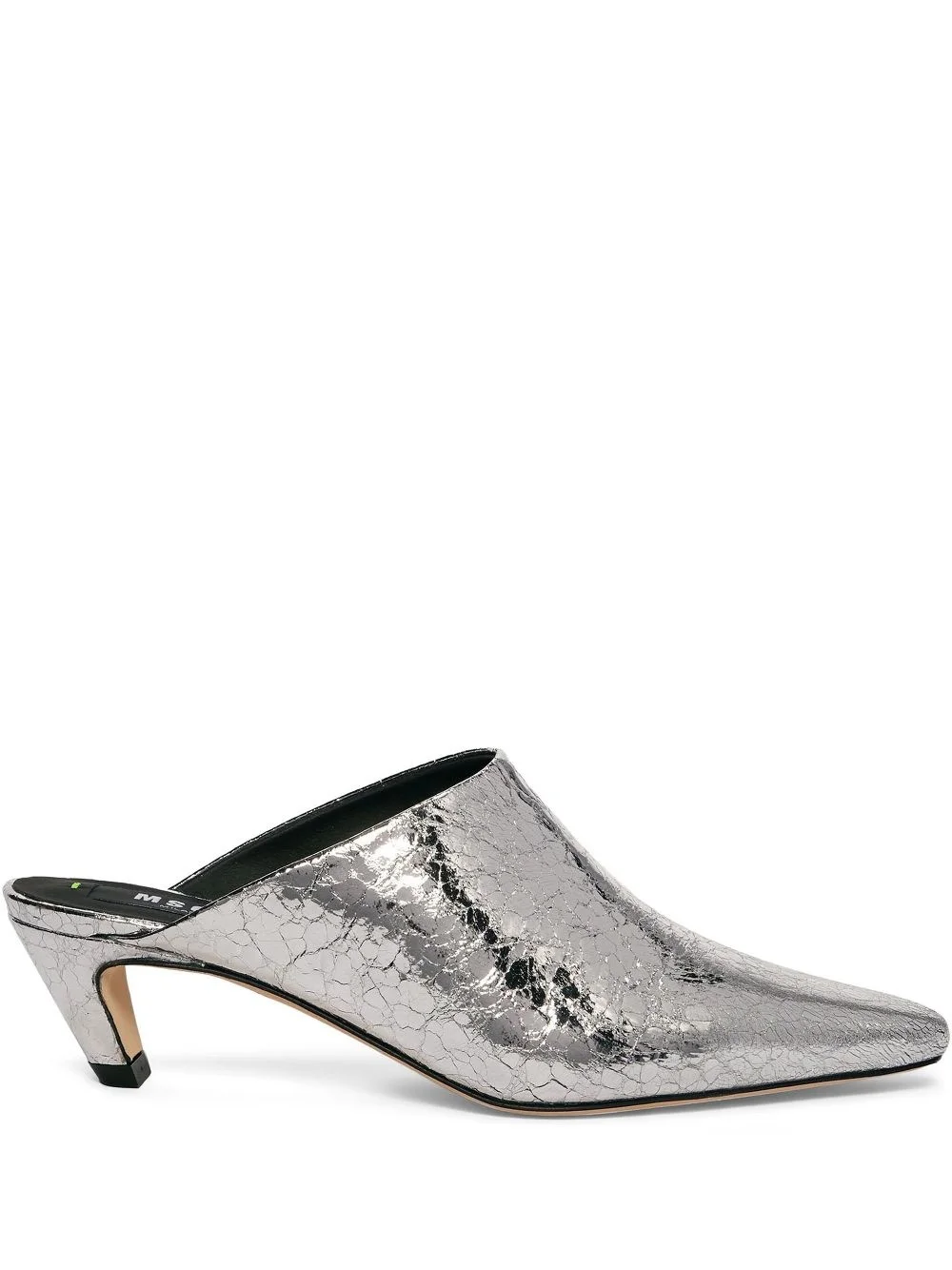 metallic leather mules Highlights - Silver-tone - Leather - Metallic effect - Embossed crocodile effect - Square toe - Kitten heel - Branded leather insole - Slip-on style Made in Italy Composition Outer: Leather 100% Lining: Leather 100% Sole: Leather 100% SIZE & FIT Measurement HEEL 2.36 in(6 cm)