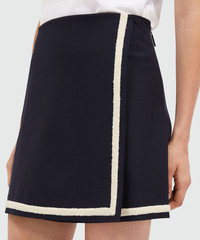 Short skirt with a flared line made of light wool fabric characterized by a fake wallet construction and enriched by profiles highlighted by bands in contrasting color and texture. Zip closure on the side. Regular fit. The model wears size S/40. CODE: 3841MDD16-257127-88 Details and fit - 96% WV / 4% EA