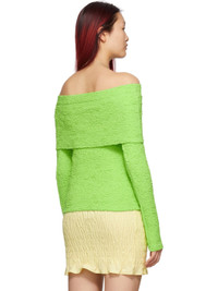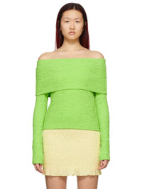 Long sleeve cotton and nylon-blend jersey off-the-shoulder blouse in green. · Crinkled detailing throughout · Foldover collar Supplier color: Fluo green 75% cotton, 25% polyamide.