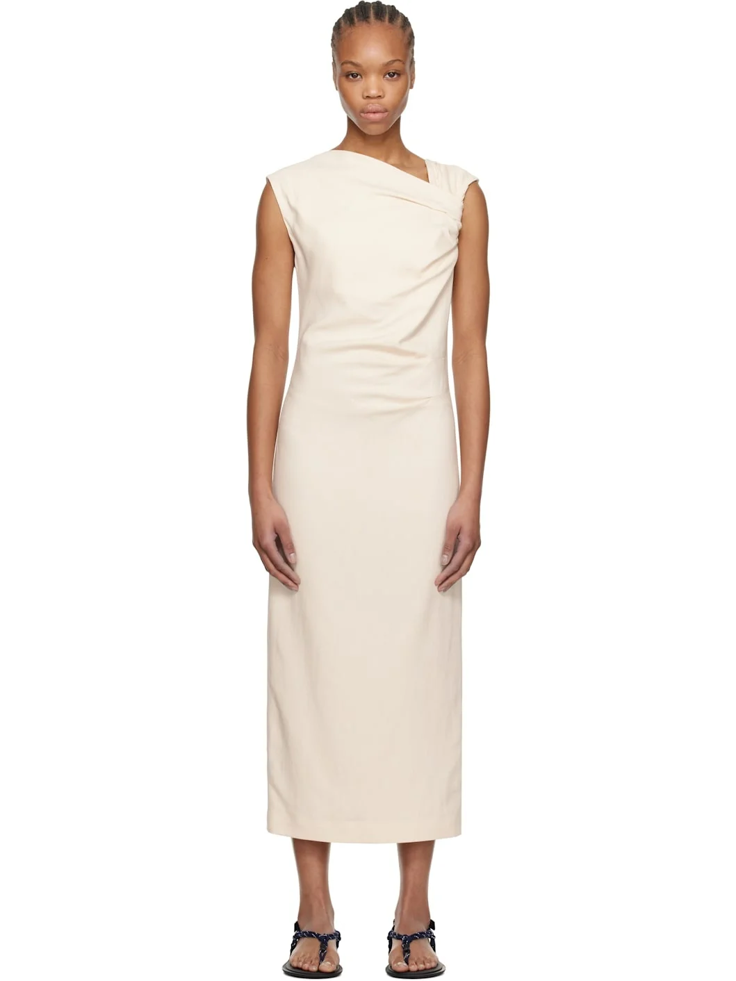 Plain-woven stretch viscose-blend midi dress. · Modified cowl neck · Darts at side seam · Twisted detailing at shoulder · Zip closure at back · Central vent at back hem · Full crepe lining Supplier color: Off-white Body: 91% viscose, 8% polyester, 1% elastane. Lining: 100% polyester. Made in Italy 251443F054003
