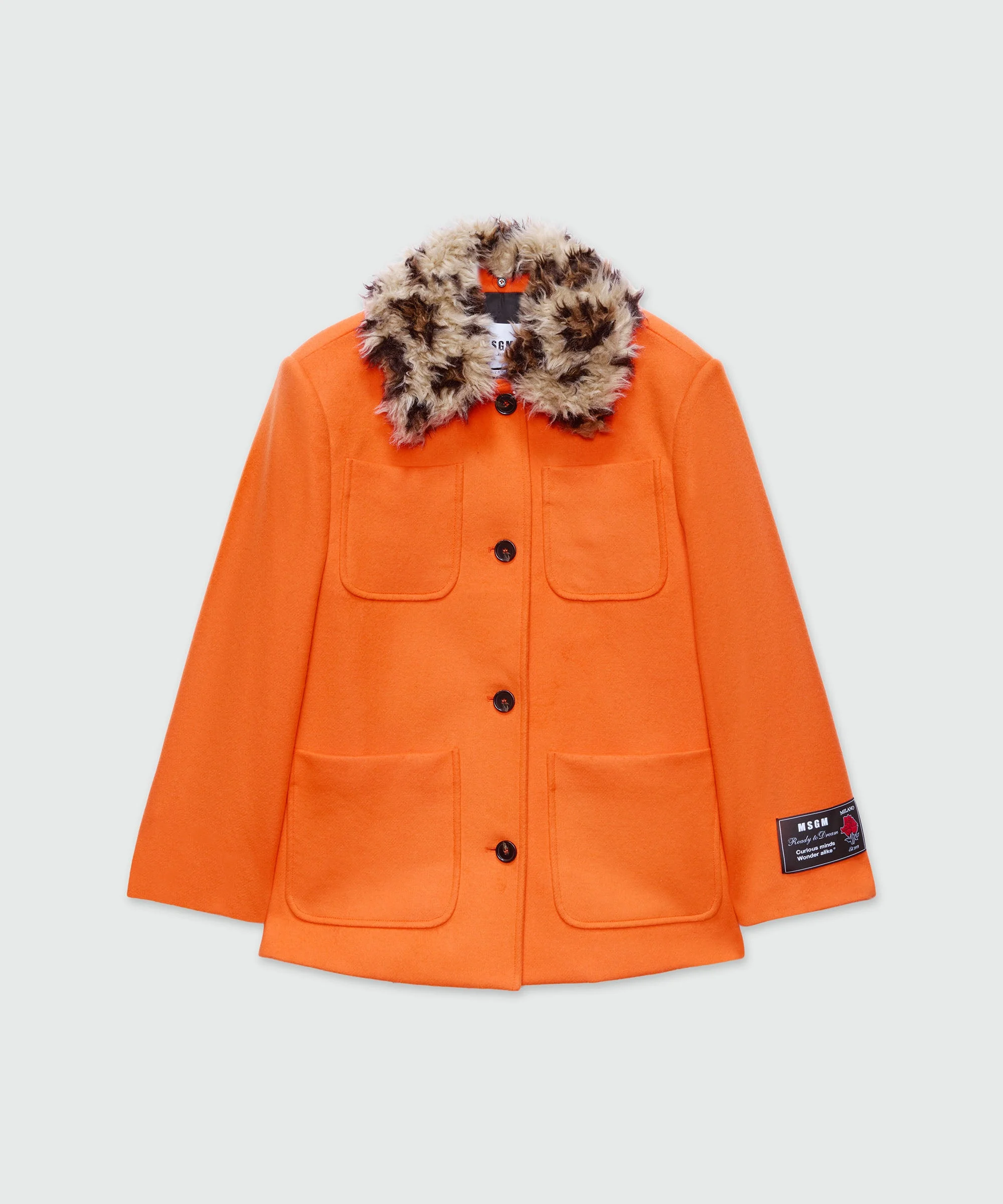 Wool cloth jacket with a shaggy faux fur collar and animal print. Front button closure, patch pockets at the chest and bottom. Long sleeves with buttoned cuffs and a tailored label detail at the cuff. Regular fit. The model is wearing a size S/40. CODE: 3941MDH18Y-257603-10 Details and fit - 75% WV / 25% PA