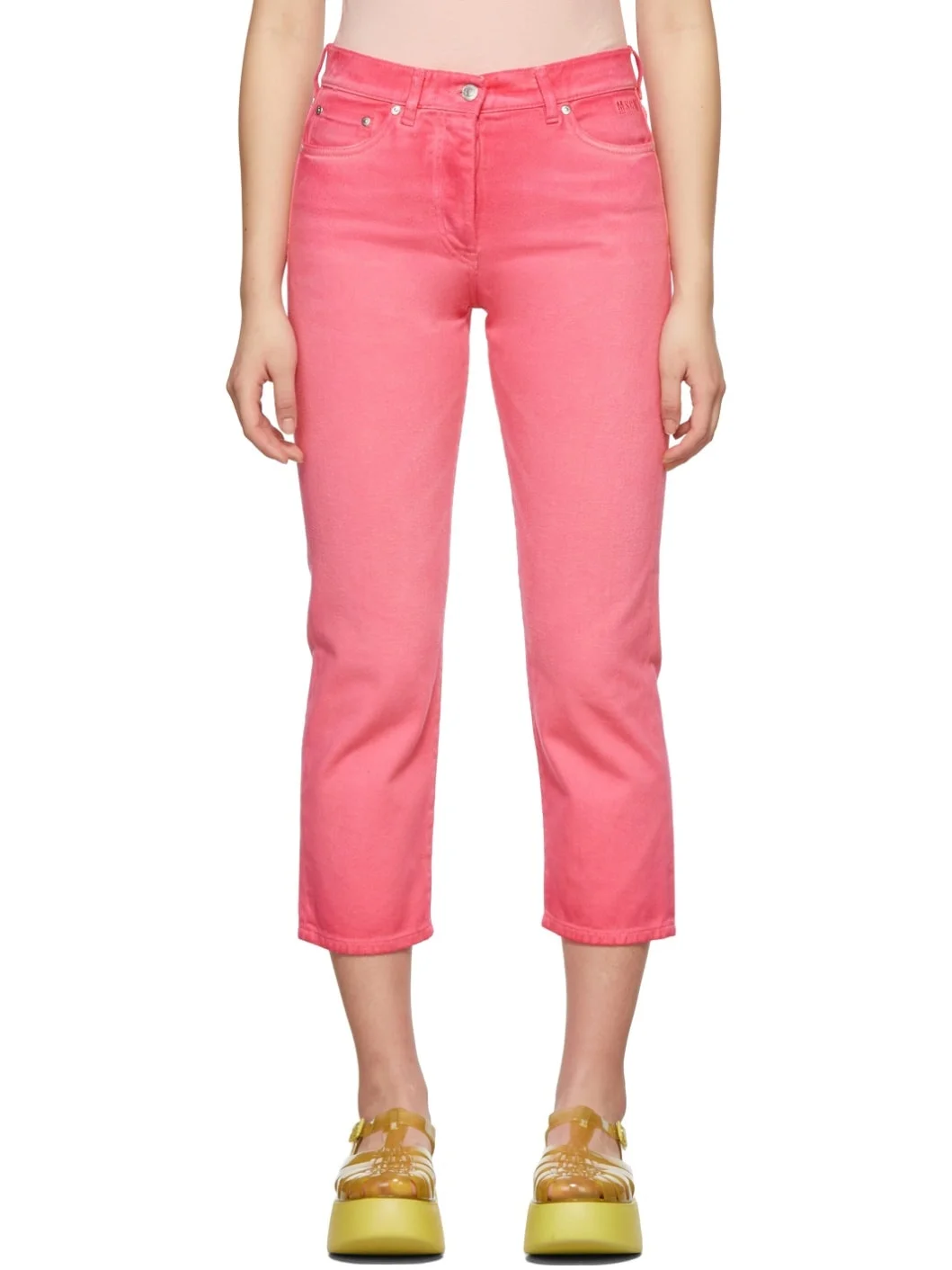 Straight-leg brushed non-stretch denim jeans in pink. Fading and whiskering throughout. · Mid-rise · Five-pocket styling · Belt loops, logo patch, and tonal embroidered logo at waistband · Cropped leg · Button-fly Each item is unique. Please note that coloration may vary. Supplier color: Pink 100% cotton.