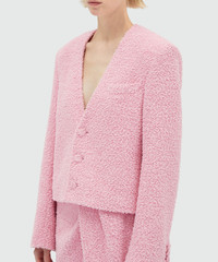 Jacket made of sponge-effect tweed characterized by a V-neck without lapels. Three-button front closure and welt chest pocket. Long sleeves with buttons at the bottom. Regular fit. The model wears size S/40. CODE: 3841MDG15-257113-12 Details and fit - 51% PA / 43% PL / 6%