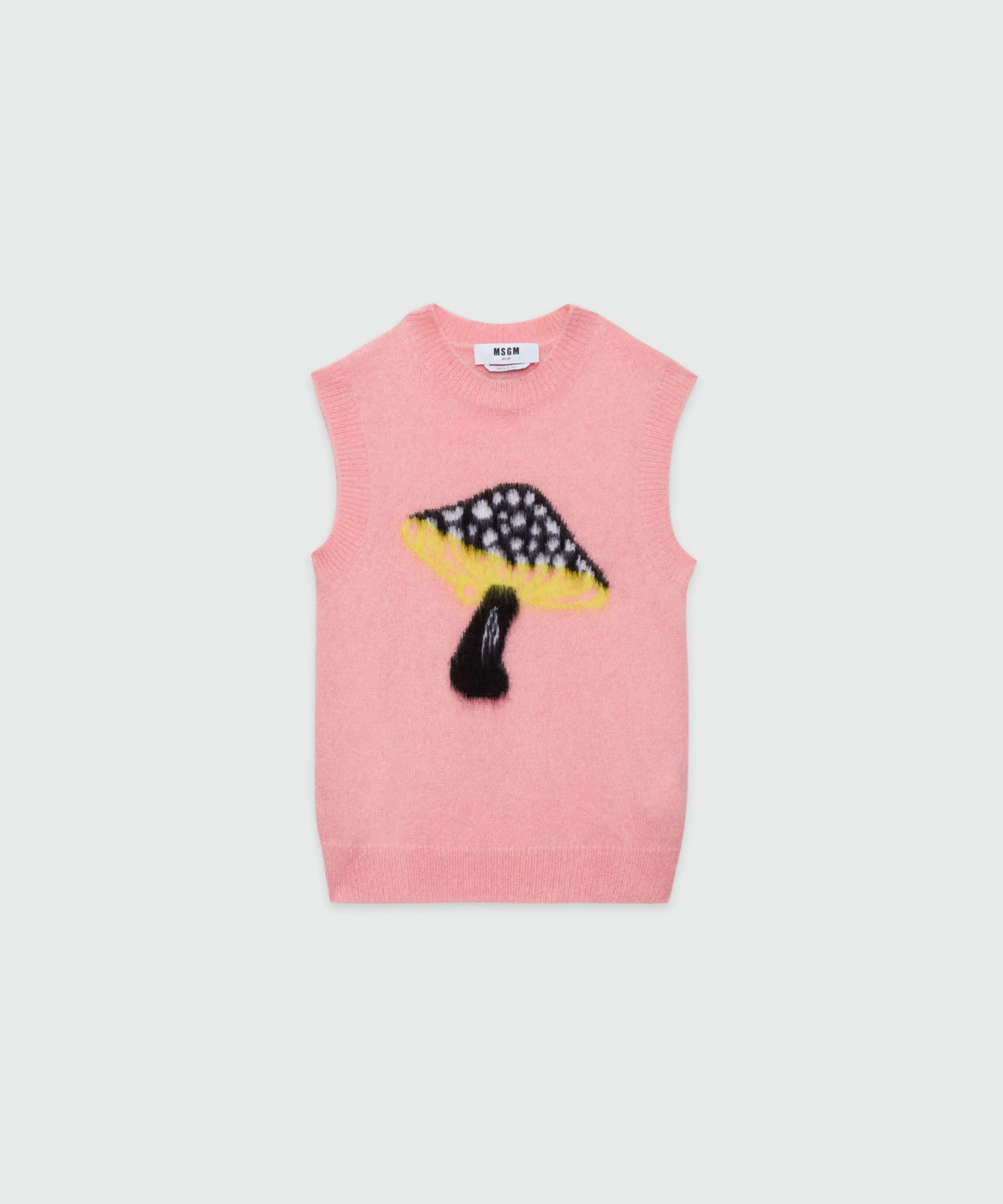 Brushed mohair vest with "FANTASTIC MUSHROOM" jacquard pattern. Ribbed crew neck, armholes, and hem. Solid-color back with MSGM label. Regular fit. Model wears size S/40. CODE: 3941MDT192-257769-12 Details and fit - 38% PC / 32% PA / 30