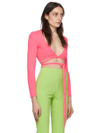 Rib knit stretch polyester cardigan. Wraparound self-tie straps at open front. Supplier color: Fluo pink 90% polyester, 6% nylon, 4% elastane.