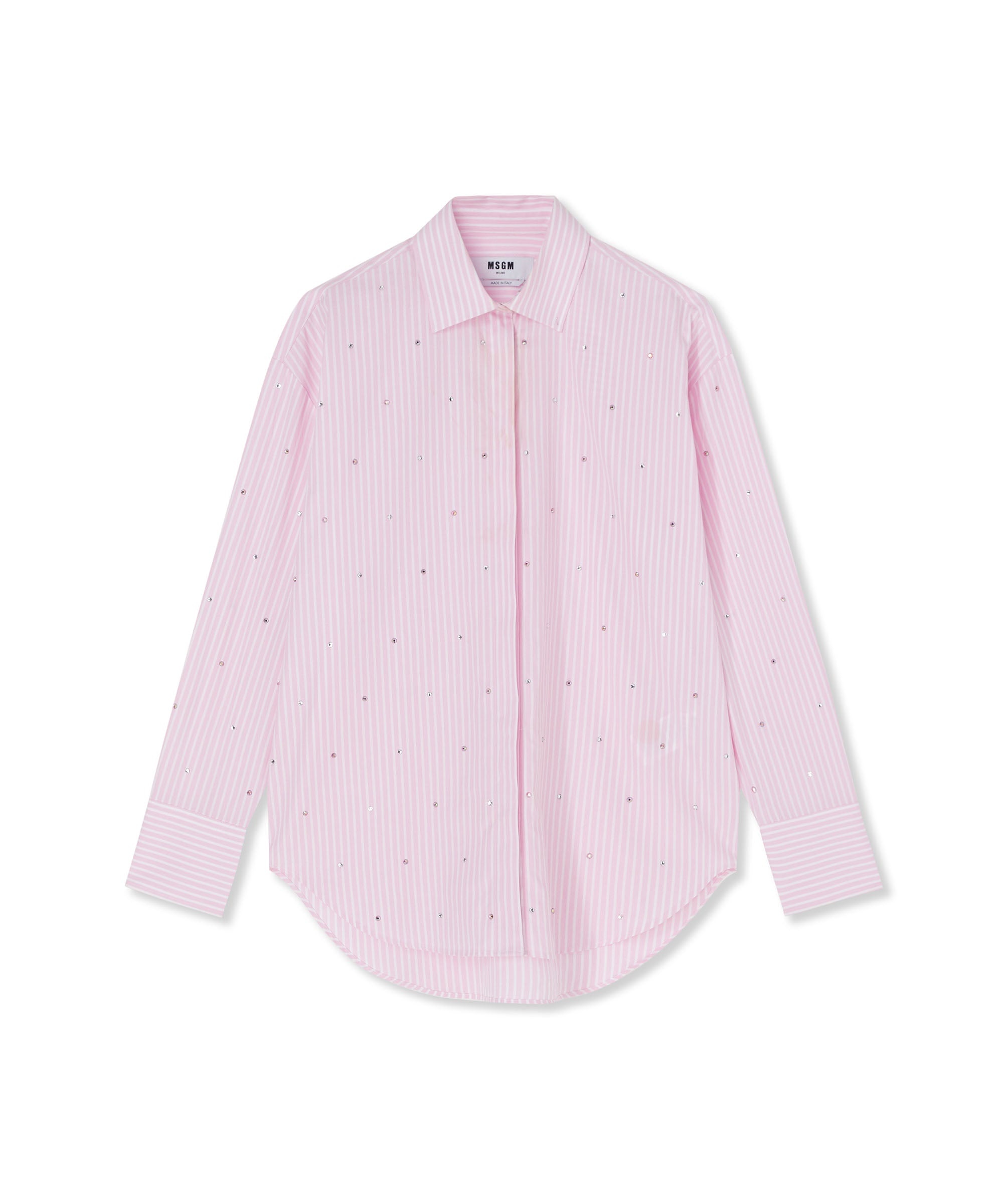 Poplin long-sleeve shirt with two-tone striped pattern and rhinestone application on the front. Classic collar, hidden button closure and rounded hem. Oversize fit. CODE: 3641MDE18X-247104-12 Details and fit - 100% CO - Model wears size S / 40 (Height: 178 cm - Chest: 80 cm - Waist 59 cm - Hips: 90 cm) - For information about a product, care and materials, please call us at +39 02 9475 5343 or contact us through Chat. You can also get help by filling out the form in the Help section.