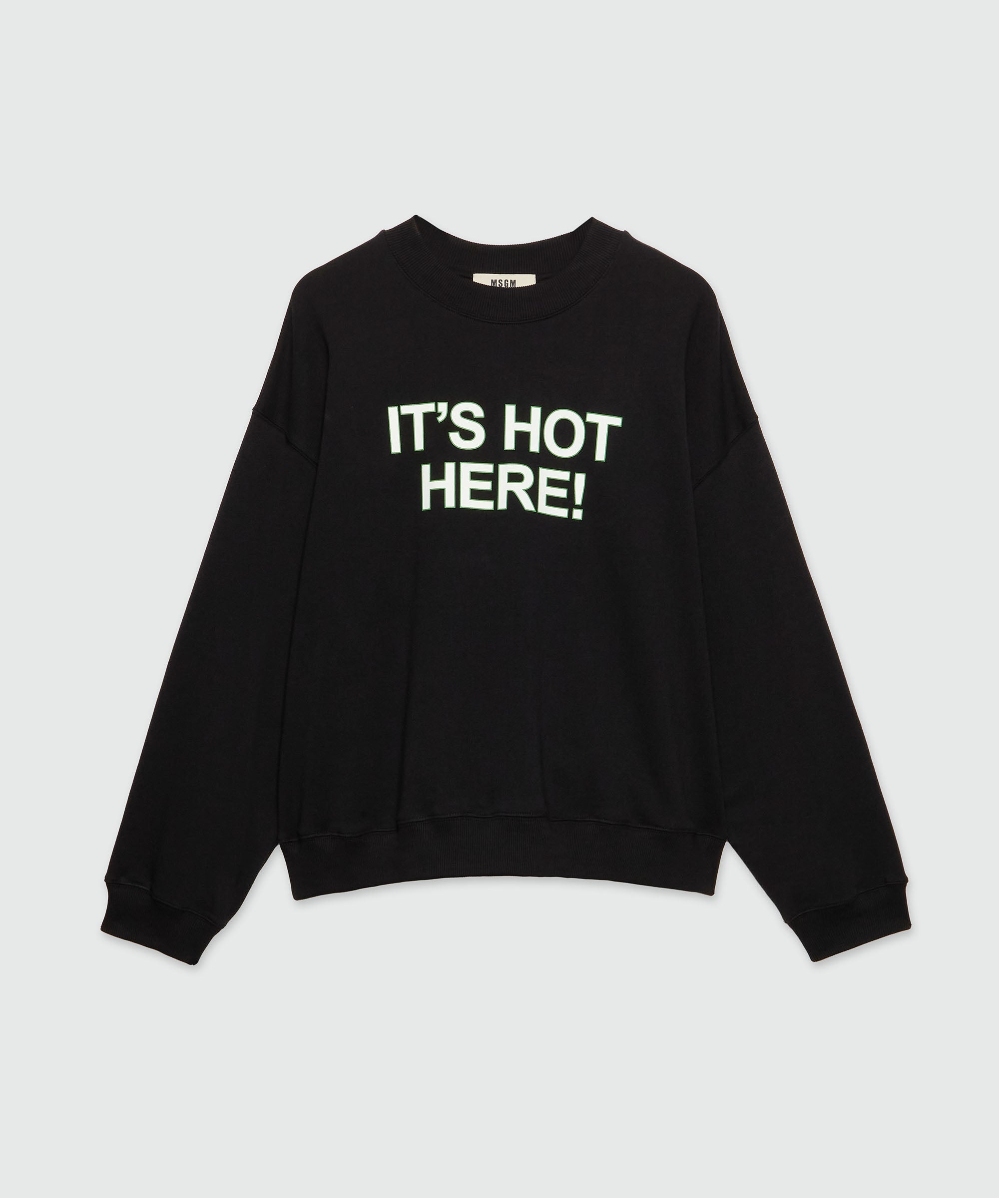 The FANTASTIC GREEN SS25 capsule is developed in collaboration with the Milanese graphics company Giga Design Studio. MSGM's irreverent soul and attention to socio-cultural changes combine with the experimental and strategic approach of Giga Design Studio, creating a collection that is a manifesto of change. Crew-neck sweatshirt in organic cotton with collection graphics printed on the back and "IT'S HOT HERE!" quotes. Wide ribbed collar, cuffs and bottom. Oversized fit. The model wears size M/48. CODE: 3846MM05-257299-99 Details and fit - 100% COO