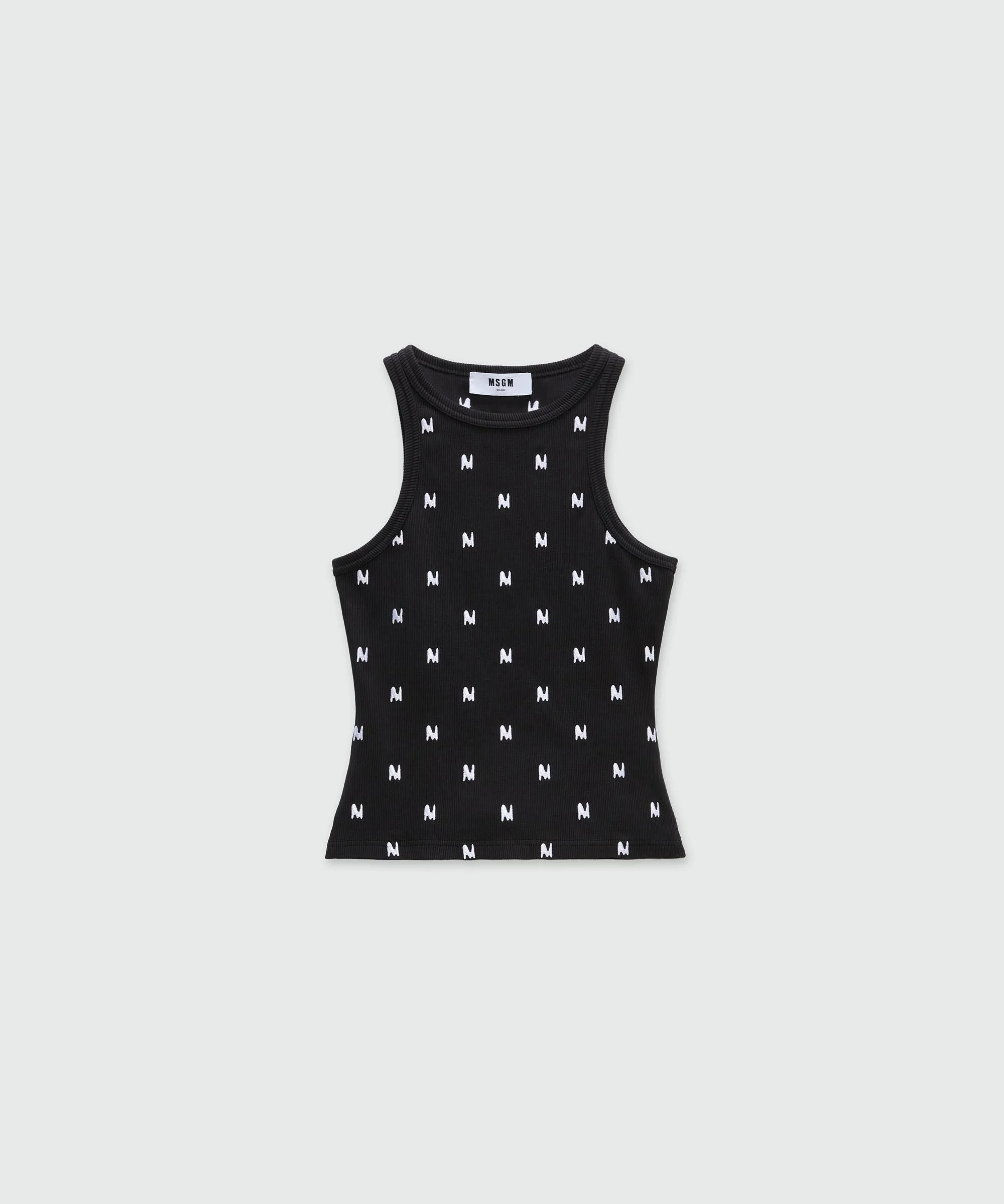 Sleeveless top in ribbed cotton jersey with an all-over embroidered "TheMwave" logo. Slim fit. The model is wearing a size S/40. CODE: 3941MDT73SE-257575-99 Details and fit - 95% CO / 5% EA