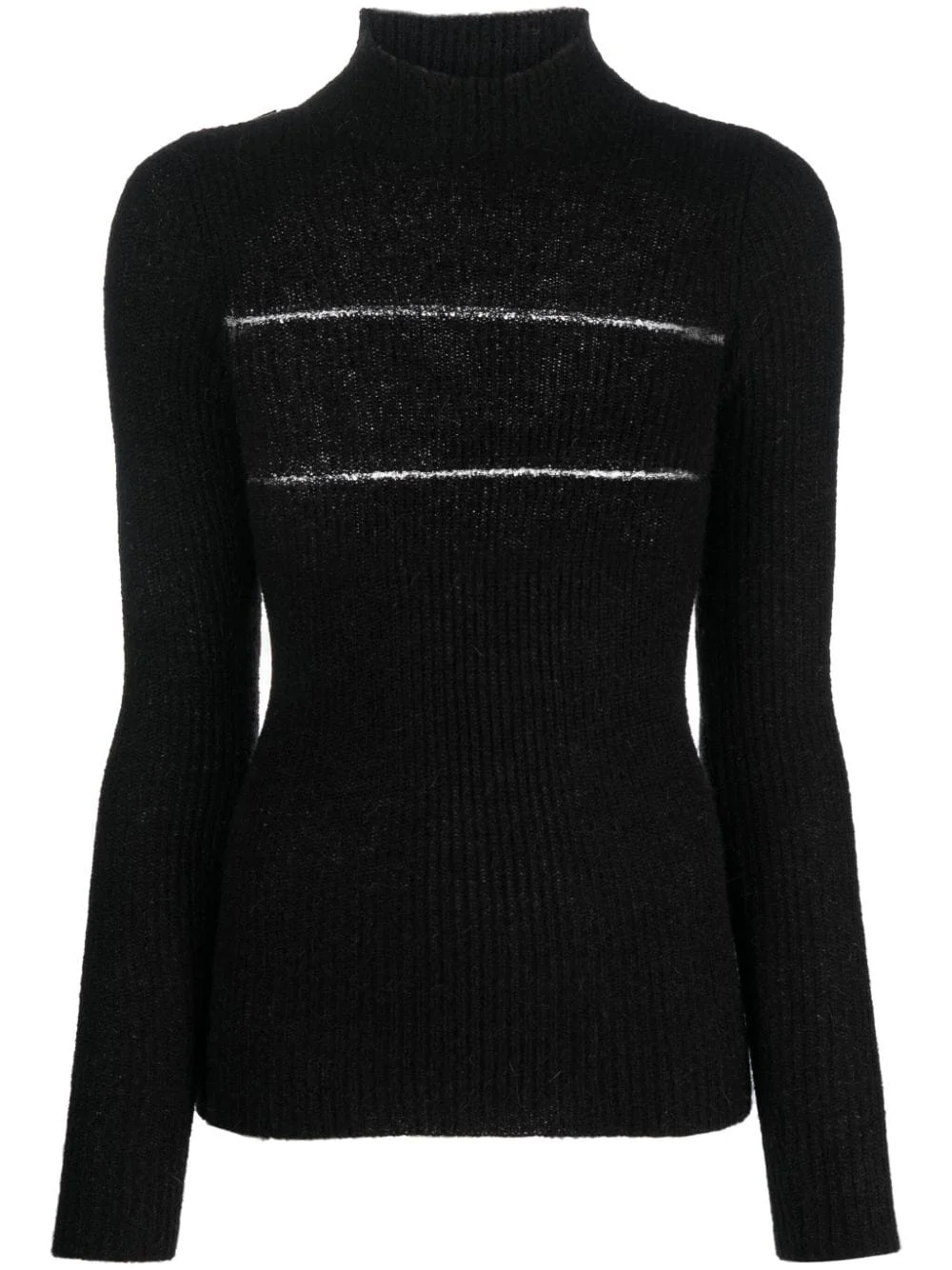mock-neck knitted top Highlights - Black - Mohair blend - Knitted construction - Brushed finish - Semi-sheer panels - Roll neck - Long sleeves - Straight hem Made in Italy Composition Acrylic (Fiber) 37%, Polyamide 33%, Mohair 30% SIZE & FIT Model measurements Height 5 ft 9 in(1.75 m) Bust/Chest 33.07 in(84 cm) Hips 35.03 in(89 cm) Waist 24.01 in(61 cm) FittingInformation Designed for a slim fit that sits just away from the body offering a close yet comfortable fit Made with a midweight knit, this piece offers some stretch This piece fits true to size – take your usual size