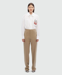 Trousers made of light wool fabric, decorated with bands in contrasting color and texture applied on the sides of the legs. Hidden closure with zip, button and hook. Double welt pockets on the sides and one on the back. Regular fit. The model wears size S/40. CODE: 3841MDP22Y-257127-24 Details and fit - 96% WV / 4% EA