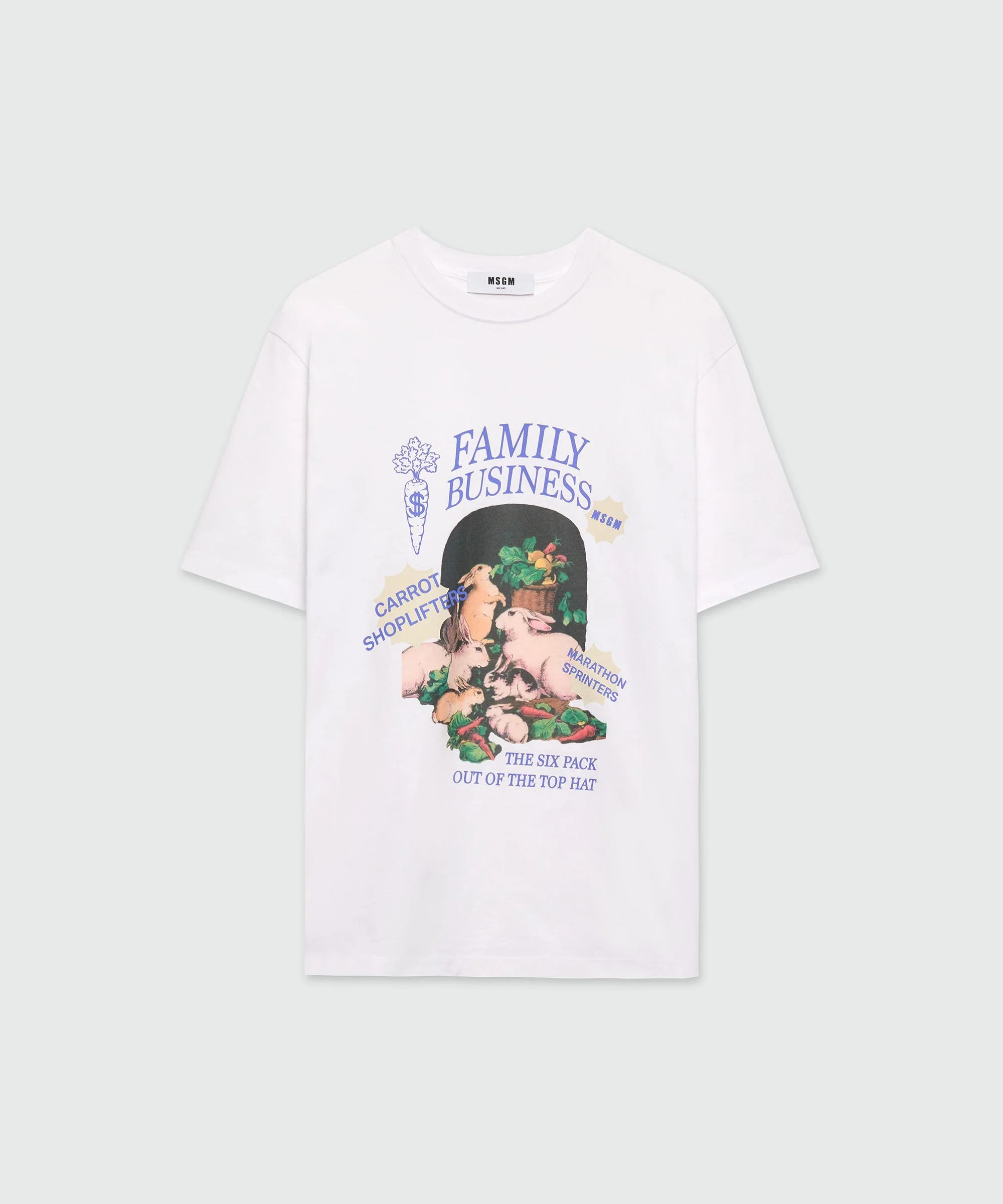 Cotton jersey T-shirt with "Family Business" graphic printed on the front. Ribbed crewneck, cuffs and hem finished with double stitching. Dropped shoulders for comfort and a relaxed style. Oversized fit. Model wears size S/40. CODE: 3941MDM112SE-257590-01 Details and fit - 100% CO