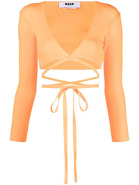 wrap knitted crop top Following the brand's casual style with an irreverent touch, this cropped top from MSGM arrives in a neon orange hue highlited with multiple crossover straps at the hem. Its design has a ribbed knit construction and is completed by a sleek V-neck. Highlights - Orange - Fine knit - Wraparound style - V-neck - Self-tie fastening - Long sleeves - Straight hem Made in Italy Composition Polyester 90%, Polyamide 6%, Elastane 4% SIZE & FIT Model measurements Height 5 ft 10 in(1.78 m) Bust/Chest 31.49 in(80 cm) Hips 36.22 in(92 cm) Waist 25.59 in(65 cm) Washing instructions Hand Wash