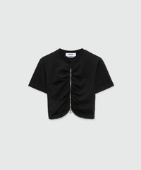 Cropped cotton jersey T-shirt with a center zip and gathered detailing for a draped effect. Crew neck, short sleeves, tone-on-tone embroidered MSGM logo on the back. Slim fit. The model is wearing size S/40. CODE: 3941MDM91-257798-99 Details and fit - 100% CO