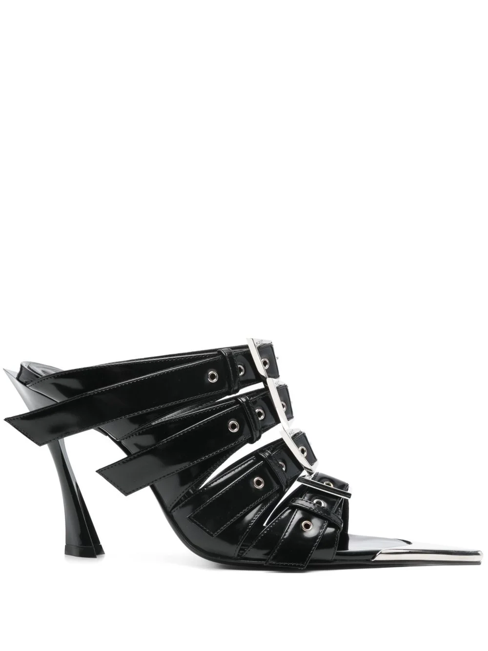 100mm buckle-detailed sandals Highlights - Black - Calf leather - Polished effect - 100mm high sculpted heel - Multiple decorative buckle detailing - Open pointed toe - Branded leather insole - Rubber sole Made in Italy Composition Leather 100% SIZE & FIT Measurement HEEL 3.93 in(10 cm)