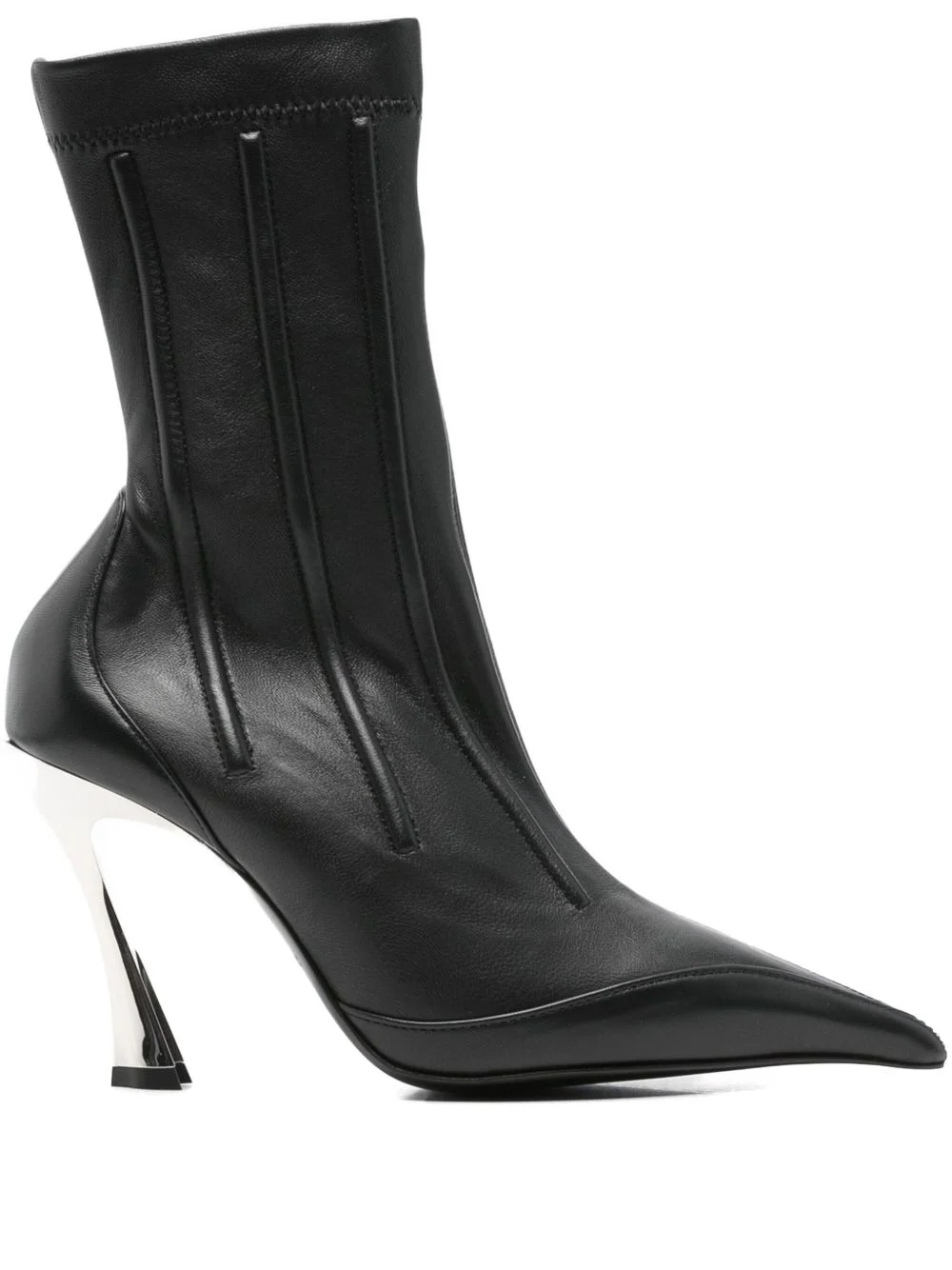 95mm leather ankle boots Highlights - Black - Leather - Side zip fastening - Stiletto heel - Pointed toe - Branded insole Made in Italy Composition Outer: Leather 100% Lining: Fabric 100% Sole: Calf Leather 100% SIZE & FIT Measurement HEEL 3.74 in(9.5 cm)