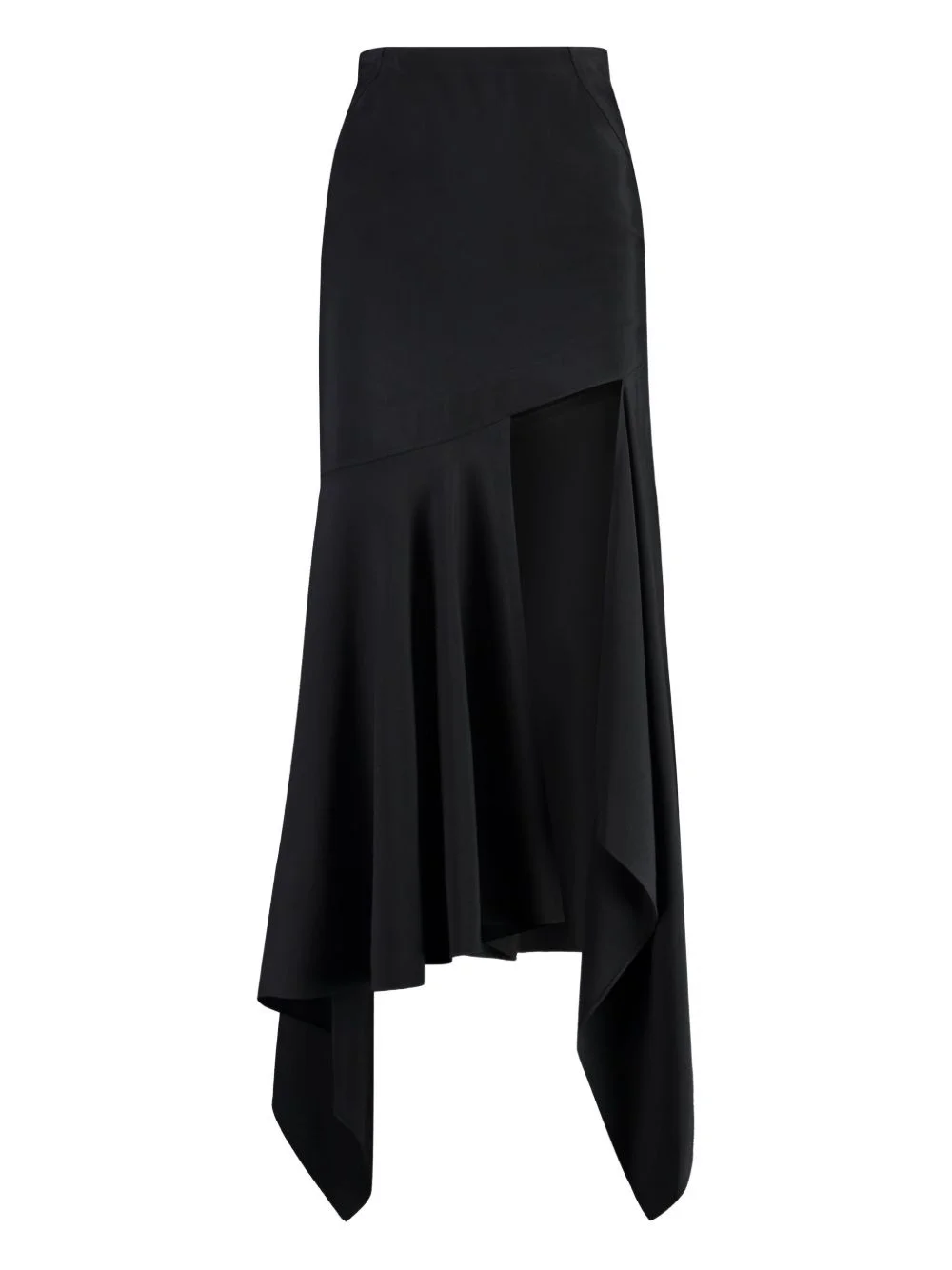 asymmetric-hem crepe skirt Highlights - Black - High slit - Flared panel - Concealed zip fastening Imported Composition Viscose 76%, Virgin Wool 24% Washing instructions Read Manufacturer Guidelines