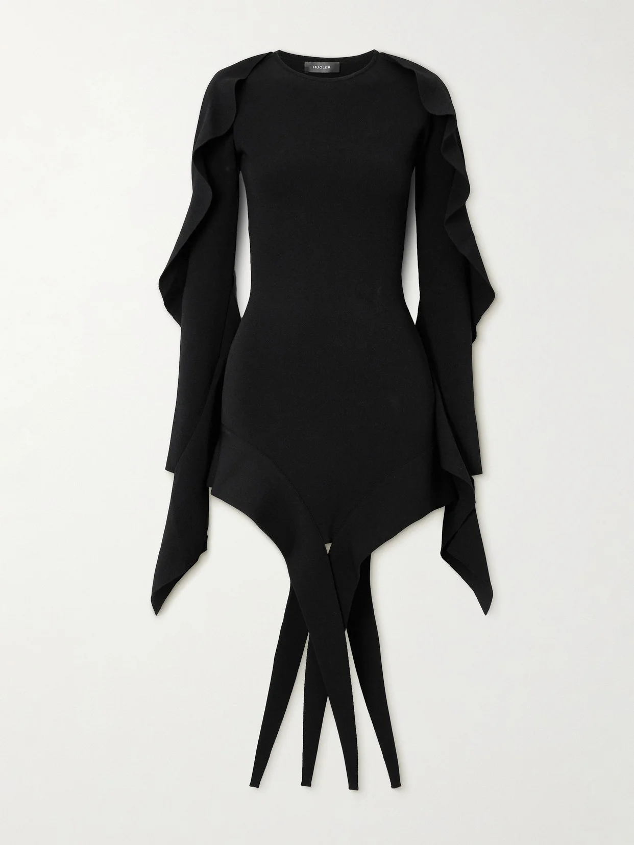 For Spring '24; Mugler's Creative Director Casey Cadwallader "blends his reverence for women's power with a theatrical homage to ocean creatures". Made from stretch-knit, this mini dress has exaggerated ruffled sleeves and an asymmetric hem defined by sharp cutouts. Style yours with statement heels to recreate the runway look.