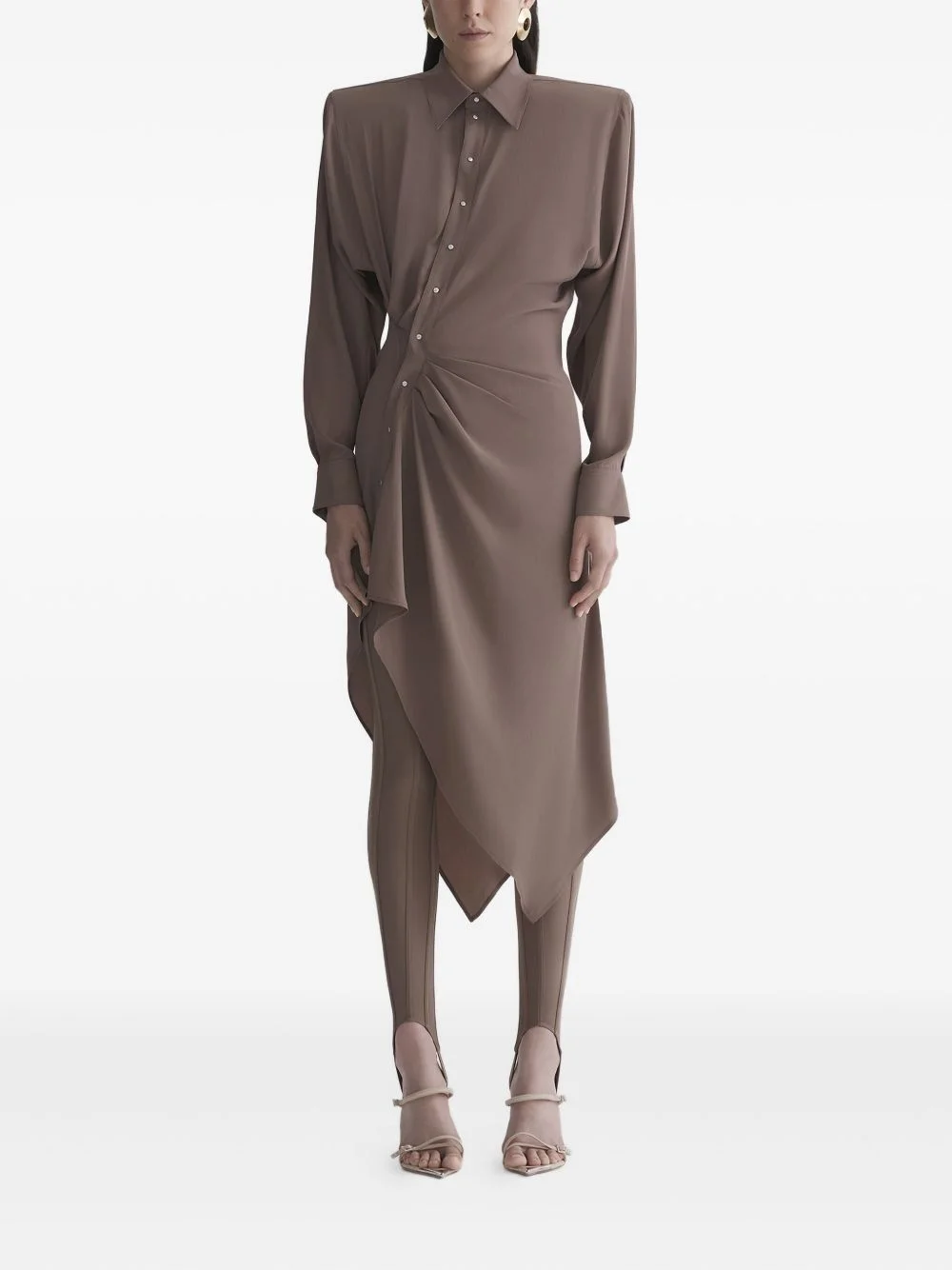 asymmetric shirt dress Highlights - Brown - Structured shoulders - Asymmetrical hem - Button fastening - Draped detail - Cinched waist Imported Composition Acetate 73%, Silk 27% Washing instructions Read Manufacturer Guidelines