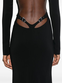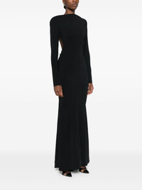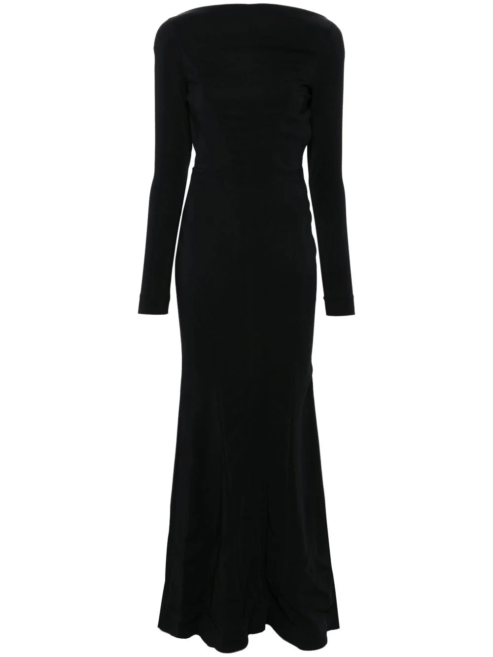 backless crepe gown Highlights - Black - Cream texture - Boat neck - Shoulder pads - Long sleeves - Dart detailing - Adjustable straps to the rear - Open back - Long length - Flared - High-low hem - Pull-on style Imported Composition Lining: Viscose 57%, Polyester 43% Outer: Viscose 96%, Elastane 4% SIZE & FIT Model measurements Height 5 ft 10 in(1.78 m) Bust/Chest 31.49 in(80 cm) Hips 37 in(94 cm) Waist 23.62 in(60 cm) FittingInformation Designed for a close fit throughout The internal shoulder pads offer a structured shape Made from a midweight fabric This piece fits true to size – take your usual size