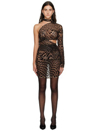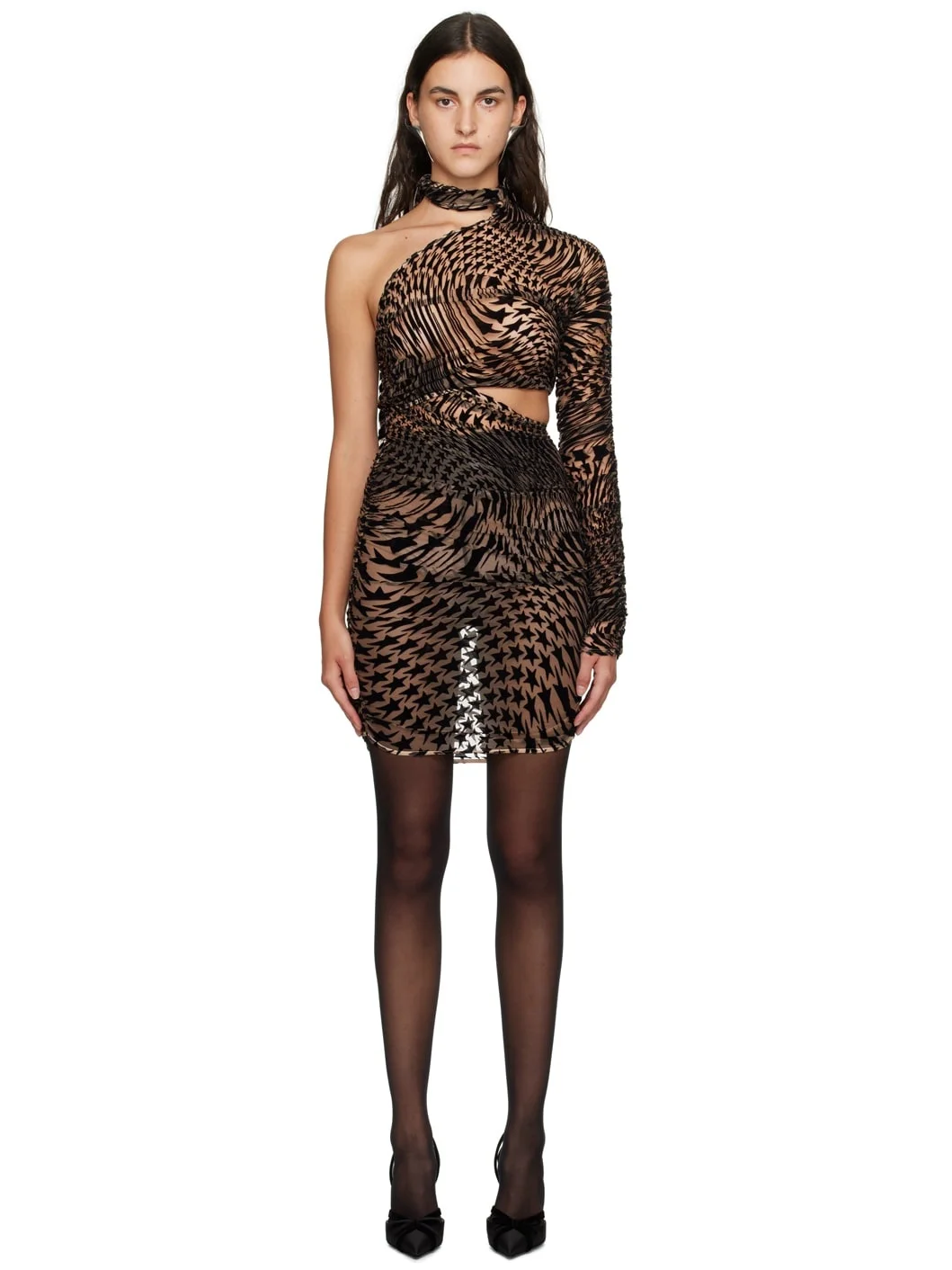 Semi-sheer stretch nylon mesh dress. Flocked graphic pattern and gathering throughout. · Single-shoulder construction · Integrated self-tie scarf for alternate styling · Cutout at side seam Supplier color: Beige/Black 77% polyamide, 23% elastane. Made in Portugal 232345F052030