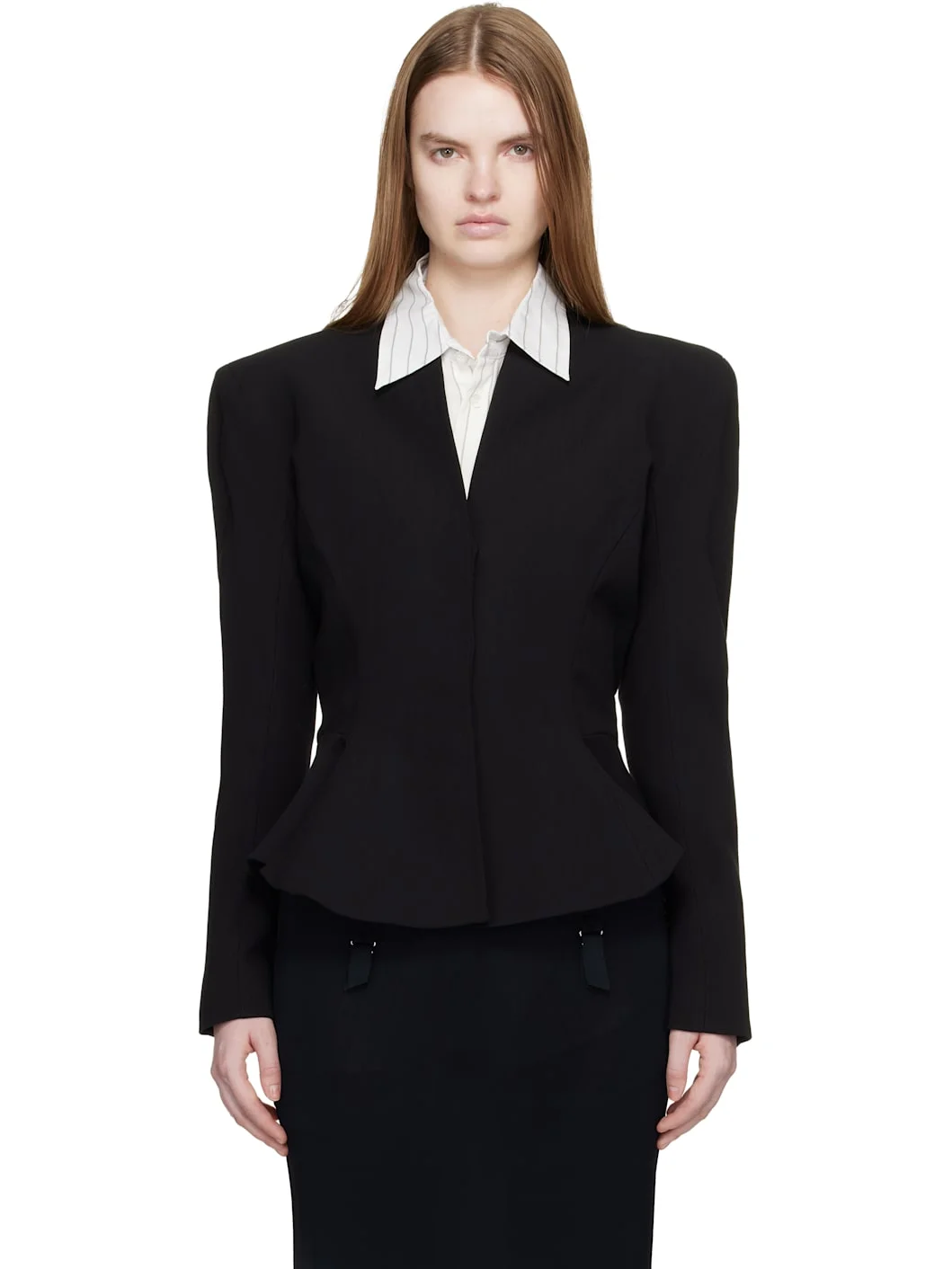 Viscose- and virgin wool-blend twill jacket. · Stand collar · Press-stud closure · Curved hem · Padded shoulders · Full satin lining Supplier color: Black Body: 78% viscose, 22% virgin wool. Lining: 100% cupro. Made in Morocco 252345F057004
