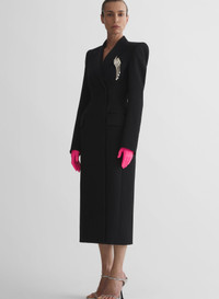 - Hourglass tailored coat in Japanese heavy wool - Peaked lapel - Fitted padded shoulders - One welt pocket with signature loop and two flap pockets - Hidden double-breasted closure with horn buttons - Back vent - Fully lined with pinstriped sleeve interior - Model is 177 cm / 5'10" and is wearing a size 36 DETAILS LINING:100% COTTON MAIN FABRIC:55% POLYESTER 43% WOOL 2% ELASTANE made in UKRAINE style: 26P1MA02051020