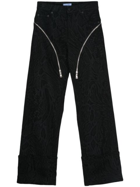 zip-embellished snake-print jeans Mugler re-works its famous curved lines as functional zips that arch over the hips and around the back of these black jeans. They’re cut from snake-print denim to sit above the waist and fall to a straight leg with cuffed hems. Highlights - Black - Stretch-cotton - Denim - Snake print - High-rise - Belt loops - Classic five pockets - Zip detail - Logo patch to the rear - Turn-up cuffs - Straight leg - Concealed fly and button fastening Made in Italy Composition Cotton 98%, Spandex/Elastane 2% SIZE & FIT FittingInformation Designed for a straight-leg fit, these jeans allow for a close fit at the waist and an unrestricted and comfortable fit over the leg Constructed from stretch denim, this piece offers a stretch fit with durability This piece fits true to size – take your usual size
